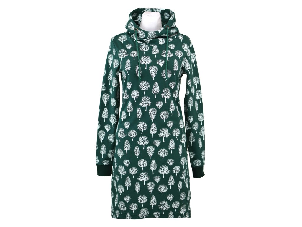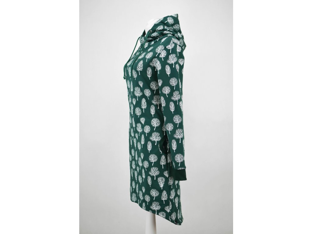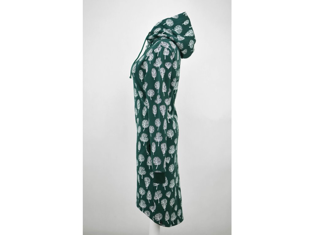 Mikinové šaty z úpletu s prodlouženou délkou rukávů, velkou kapucí se šňůrkami na stažení, kapsy lemované nápletem. Zadní díl je prodloužený. Pohodlný sportovně-ležérní střih. Příjemný hřejivý kousek na chladné dny. Nositelné přes džíny či legíny... :)