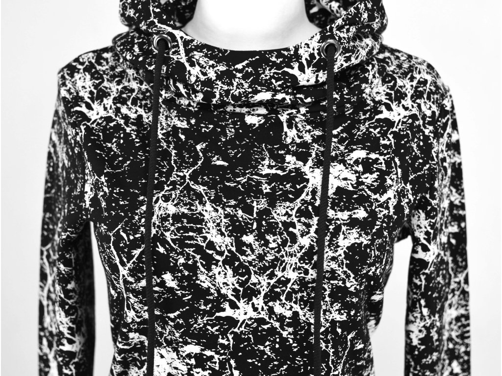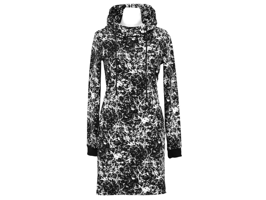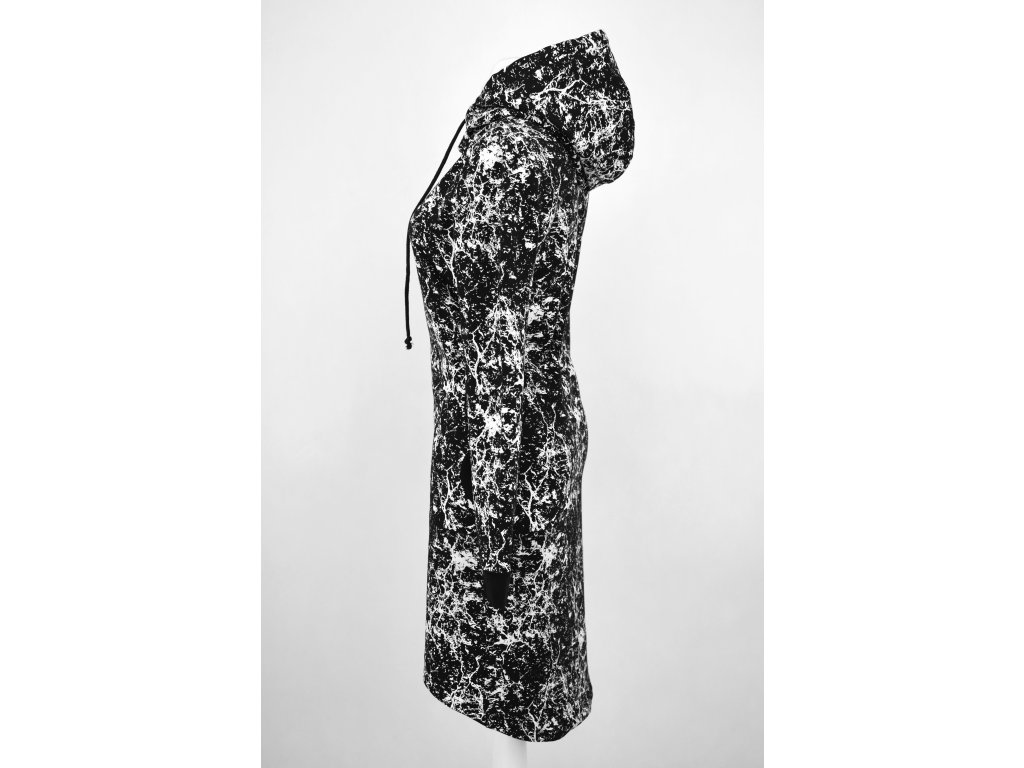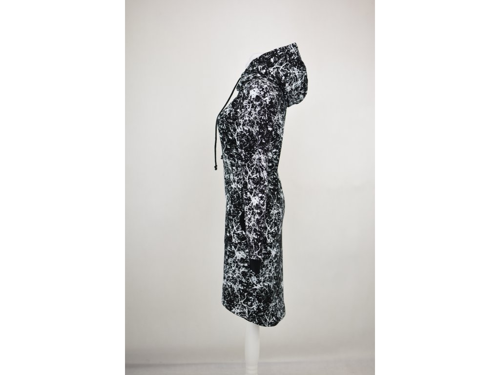 Mikinové šaty z úpletu s prodlouženou délkou rukávů, velkou kapucí se šňůrkami na stažení, kapsy lemované nápletem. Zadní díl je prodloužený. Pohodlný sportovně-ležérní střih. Příjemný hřejivý kousek na chladné dny. Nositelné přes džíny či legíny... :)