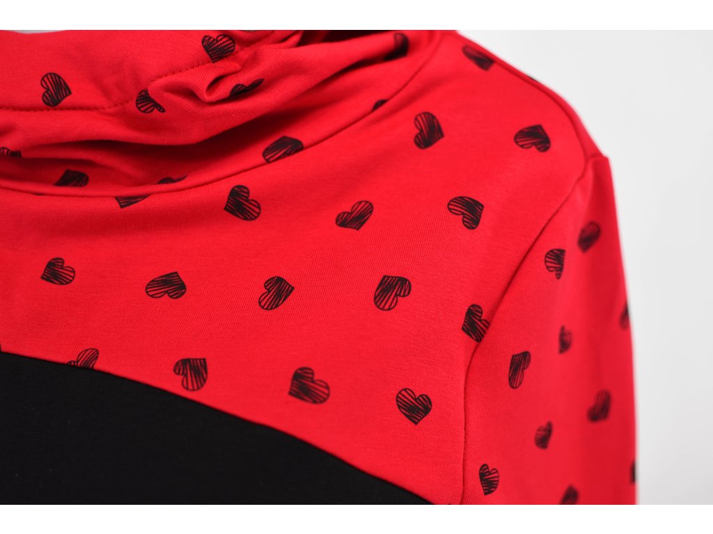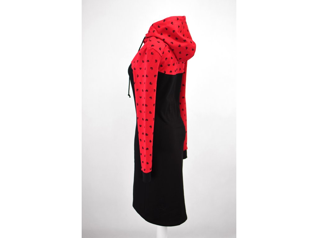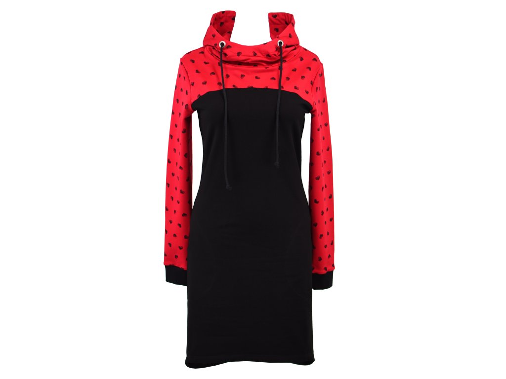 Mikinové šaty z úpletu s prodlouženou délkou rukávů, velkou kapucí se šňůrkami na stažení, kapsy lemované nápletem. Kombinované - 2 barvy. Zadní díl je prodloužený. Pohodlný sportovně-ležérní střih. Příjemný hřejivý kousek na chladné dny. Nositelné přes džíny či legíny... :)