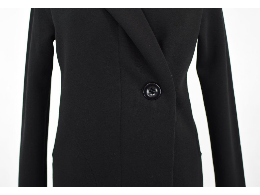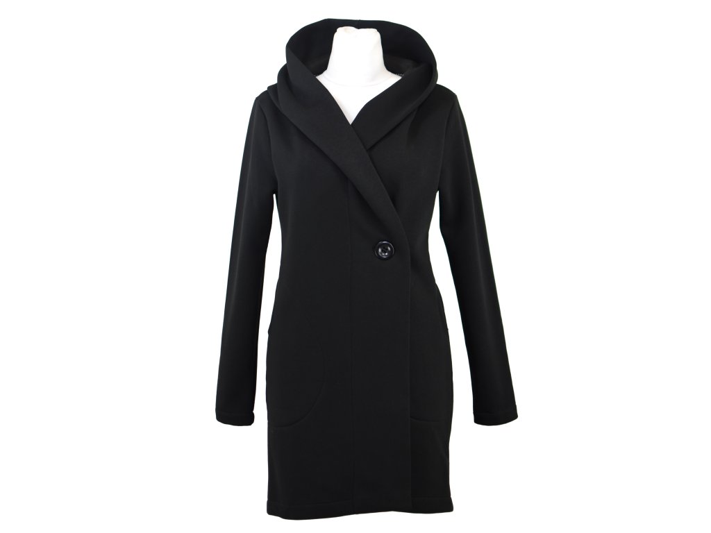 Dámský kabátek rovnějšího střihu se zapínám v pase na levé straně. Zapínání je na knoflík. Přední díl má dvojité klopy, které postupně přechází do kapuce. Můžete jej nosit více uzavřený, anebo otevřený. Není vypodšívkovaný. Samozřejmostí jsou kapsy v bocích.