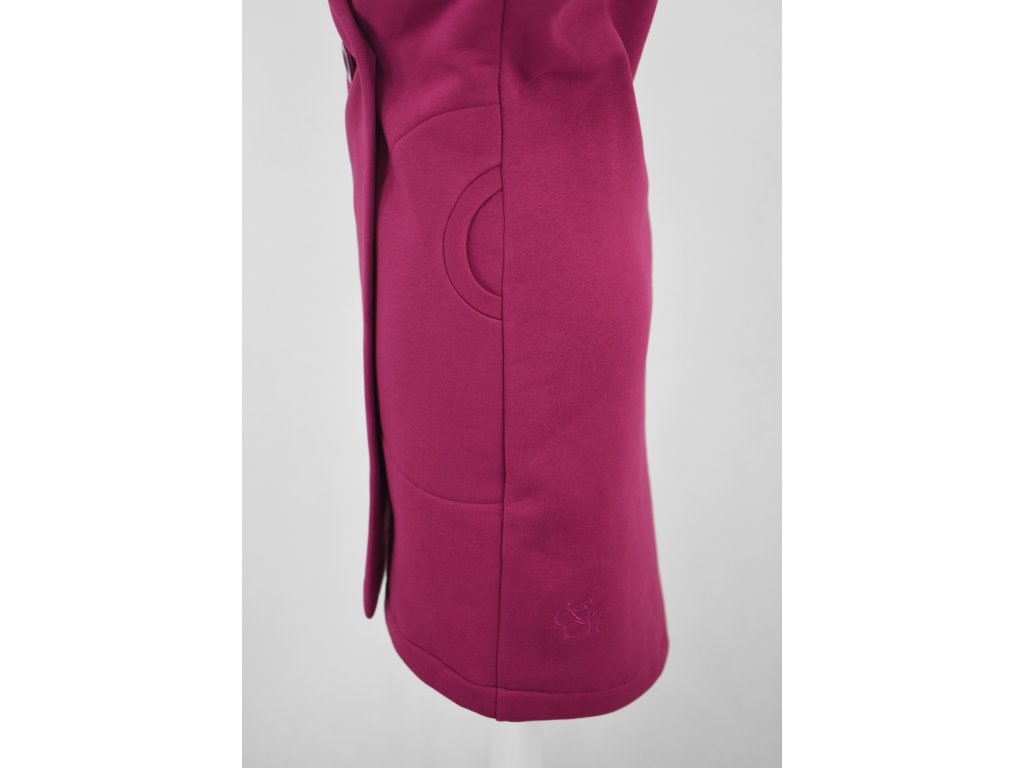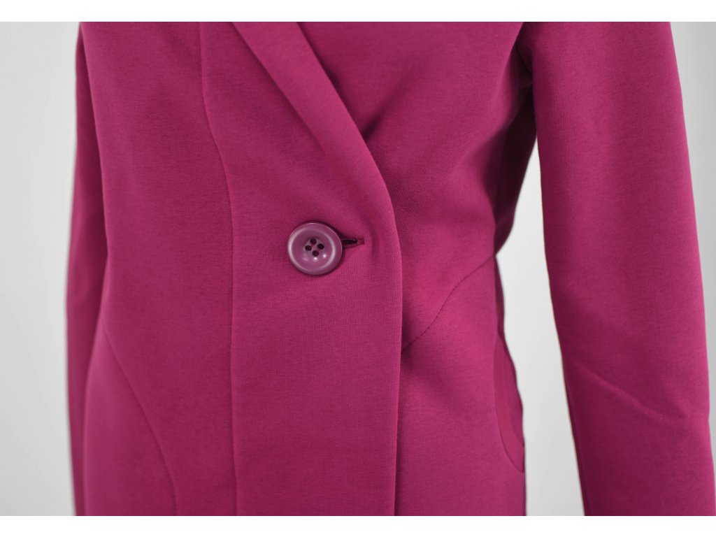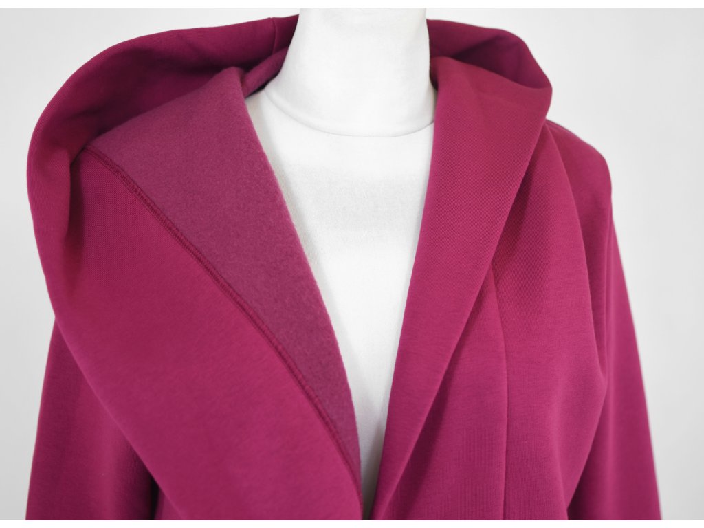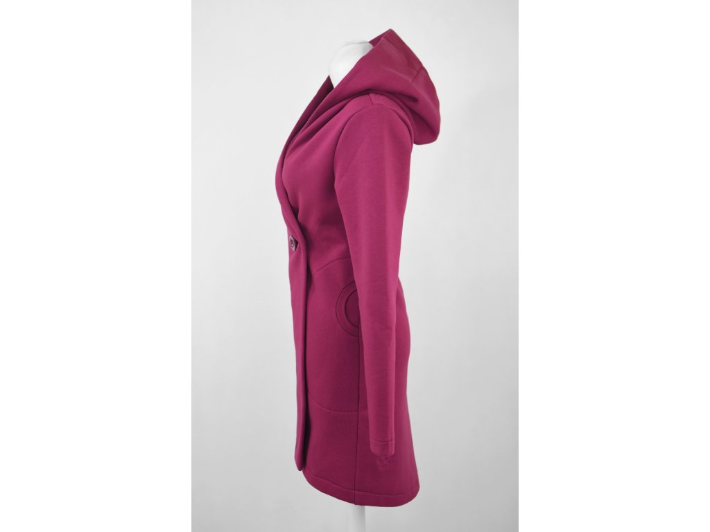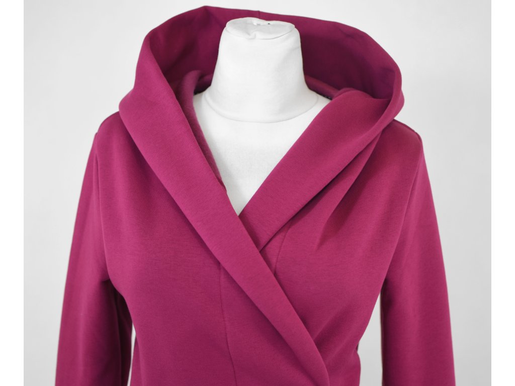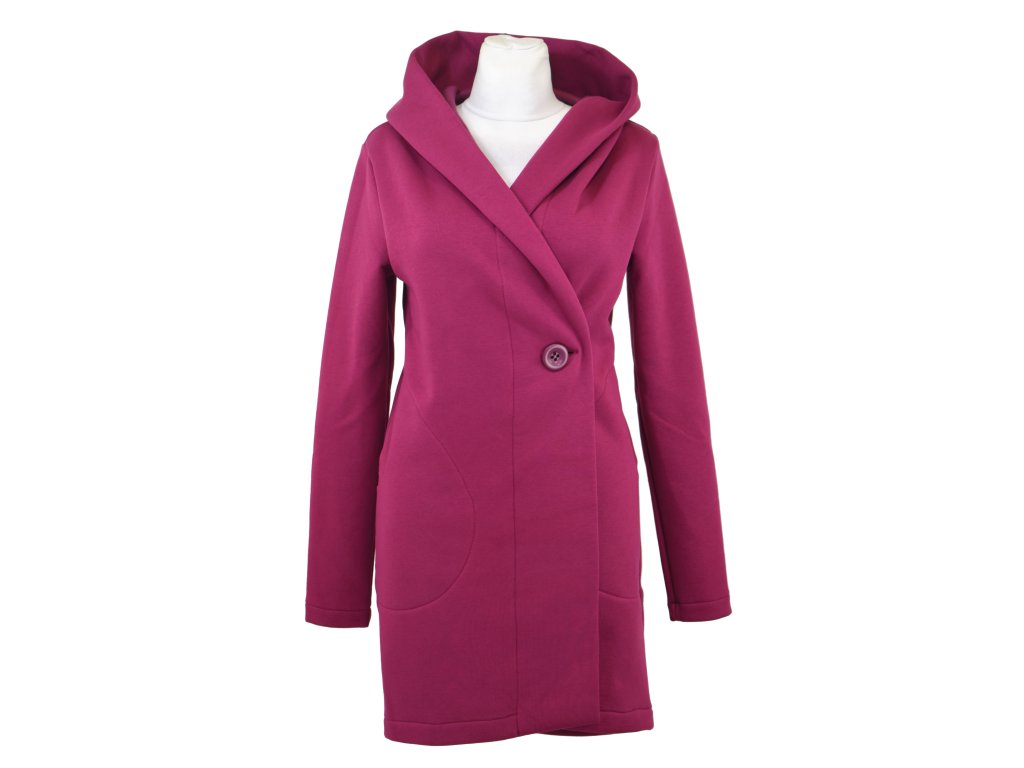 Dámský kabátek rovnějšího střihu se zapínám v pase na levé straně. Zapínání je na knoflík. Přední díl má dvojité klopy, které postupně přechází do kapuce. Můžete jej nosit více uzavřený, anebo otevřený. Není vypodšívkovaný. Samozřejmostí jsou kapsy v bocích.