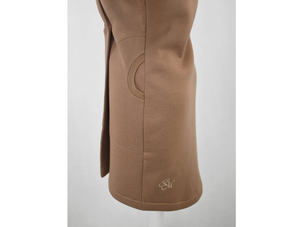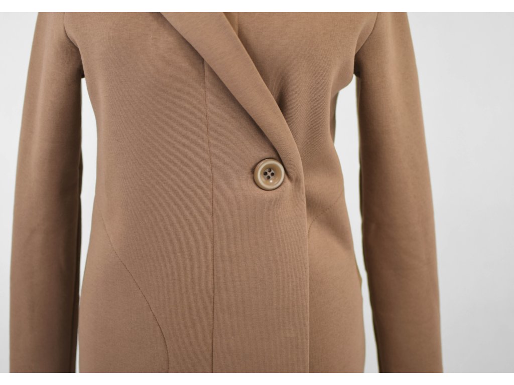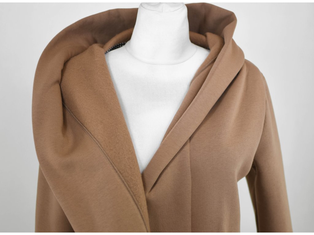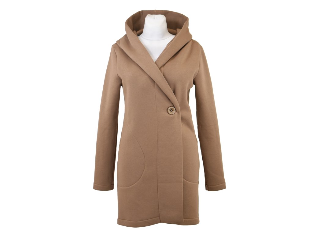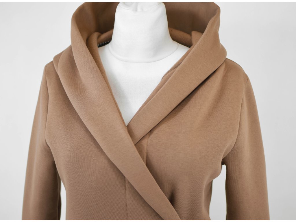 Dámský kabátek rovnějšího střihu se zapínám v pase na levé straně. Zapínání je na knoflík. Přední díl má dvojité klopy, které postupně přechází do kapuce. Můžete jej nosit více uzavřený, anebo otevřený. Není vypodšívkovaný. Samozřejmostí jsou kapsy v bocích.