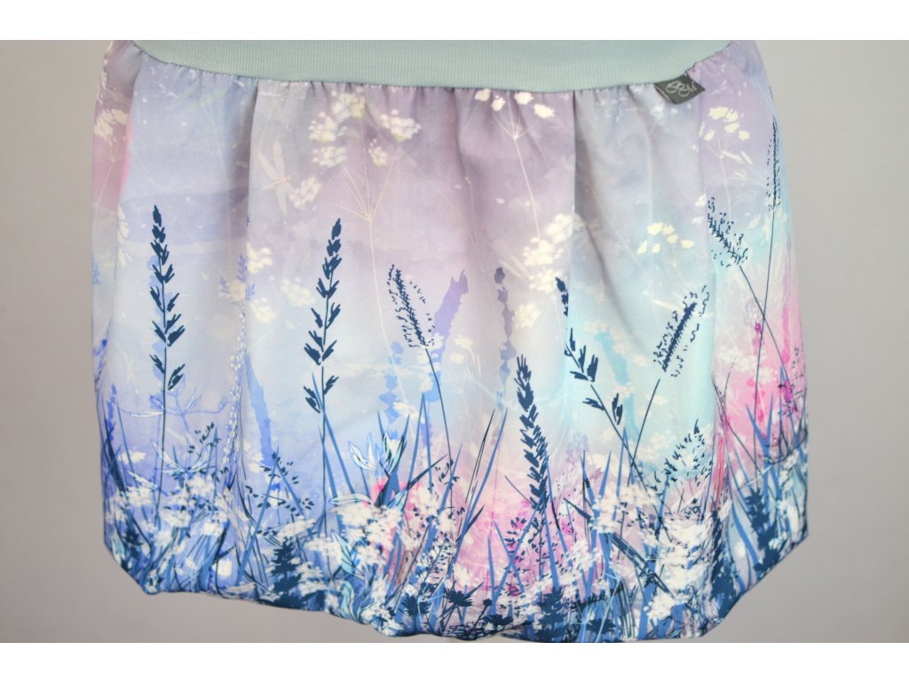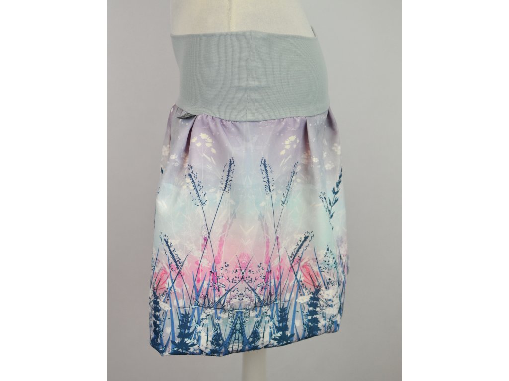 Dámská sukně balonového střihu s dvojitým elastickým pasovým okrajem vhodným pro většinu velikostí. Podšité polyesterovou látkou, která je vhodná jak na punčochy, tak na holé nohy a sukně se dá nosit celoročně. Z rubu elastického pasu je nechán otvor na případné vložení gumy na zpevnění či stažení pasu (vhodné pro velikost XS).