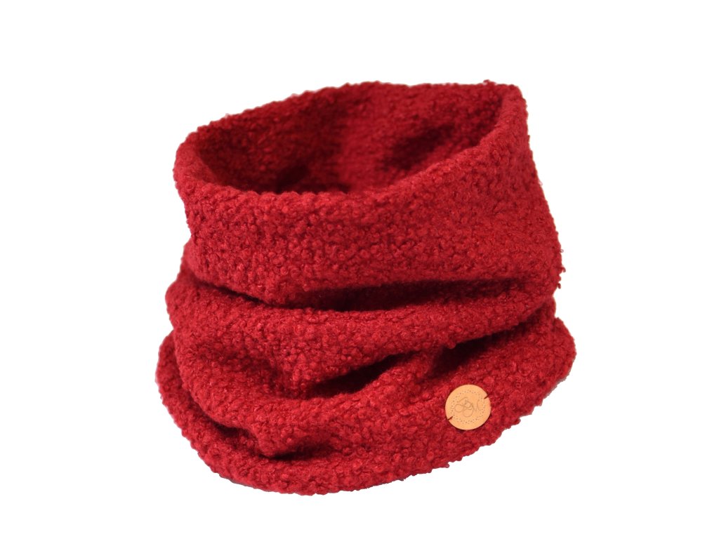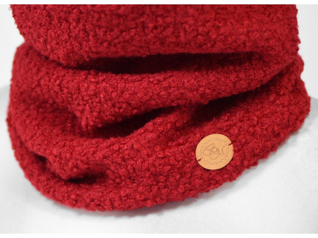 Hřejivý nákrčník z měkkého buklé v dvojité vrstvě. Buklé je tkanina, jejíž název pochází z francouzského „boucle“, což znamená „točit se/kroutit se“ - povrch ztvárněný smyčkami/očky, na první pohled vypadající jako kudrny. Je skvělým doplňkem pro chladné dny.