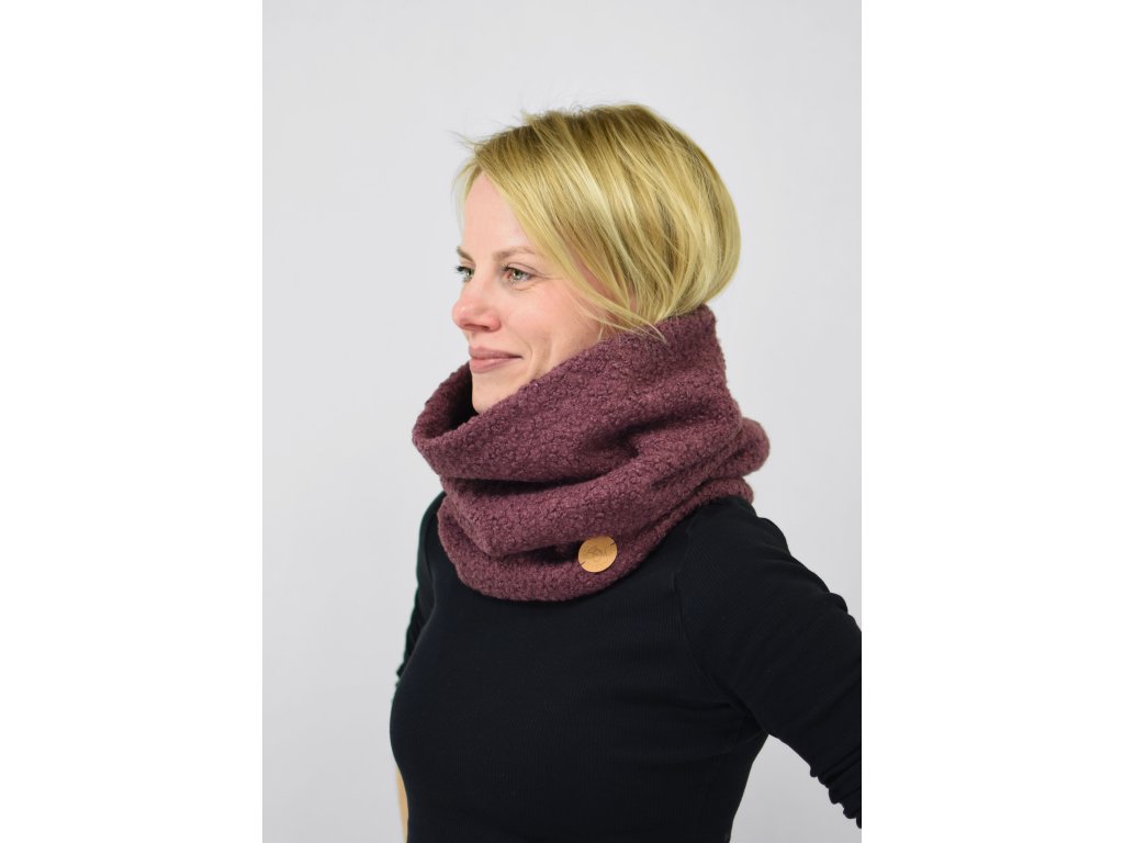Hřejivý nákrčník z měkkého buklé v dvojité vrstvě. Buklé je tkanina, jejíž název pochází z francouzského „boucle“, což znamená „točit se/kroutit se“ - povrch ztvárněný smyčkami/očky, na první pohled vypadající jako kudrny. Je skvělým doplňkem pro chladné dny.