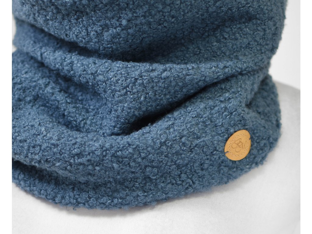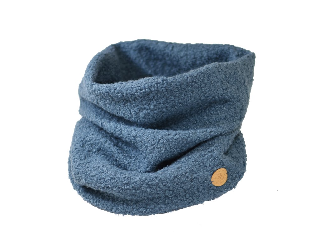 Hřejivý nákrčník z měkkého buklé v dvojité vrstvě. Buklé je tkanina, jejíž název pochází z francouzského „boucle“, což znamená „točit se/kroutit se“ - povrch ztvárněný smyčkami/očky, na první pohled vypadající jako kudrny. Je skvělým doplňkem pro chladné dny. Nákrčník je ušitý v chráněné dílně D.R.A.K. z.s. Liberec.