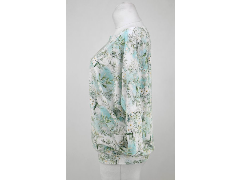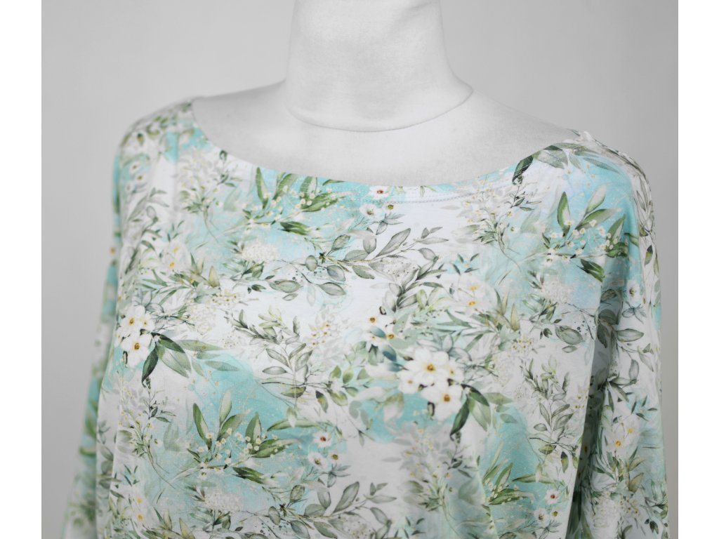 Dámské tričko netopýřího střihu z elastického úpletu. Má širší výstřih a netopýří rukávky. Je s volným hrudníkem a je podkasaný do dvojitého lemu v dolním okraji. Tričko působí volně a ležérně.