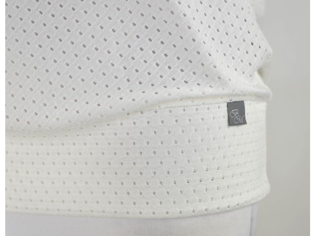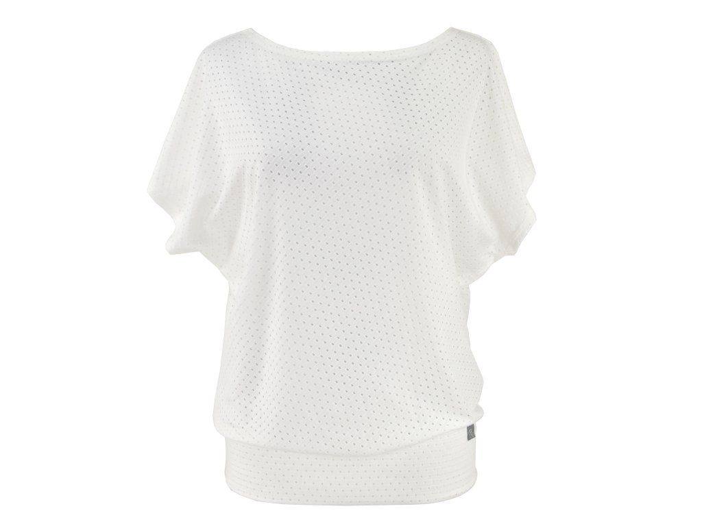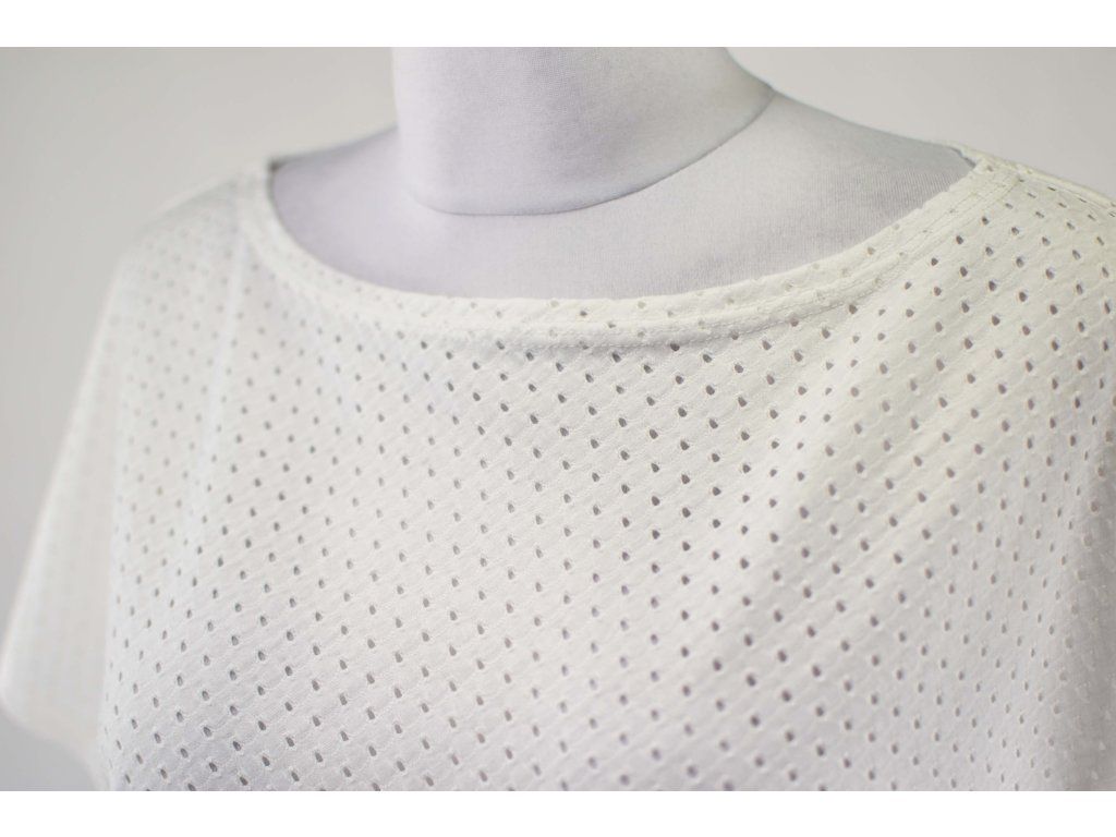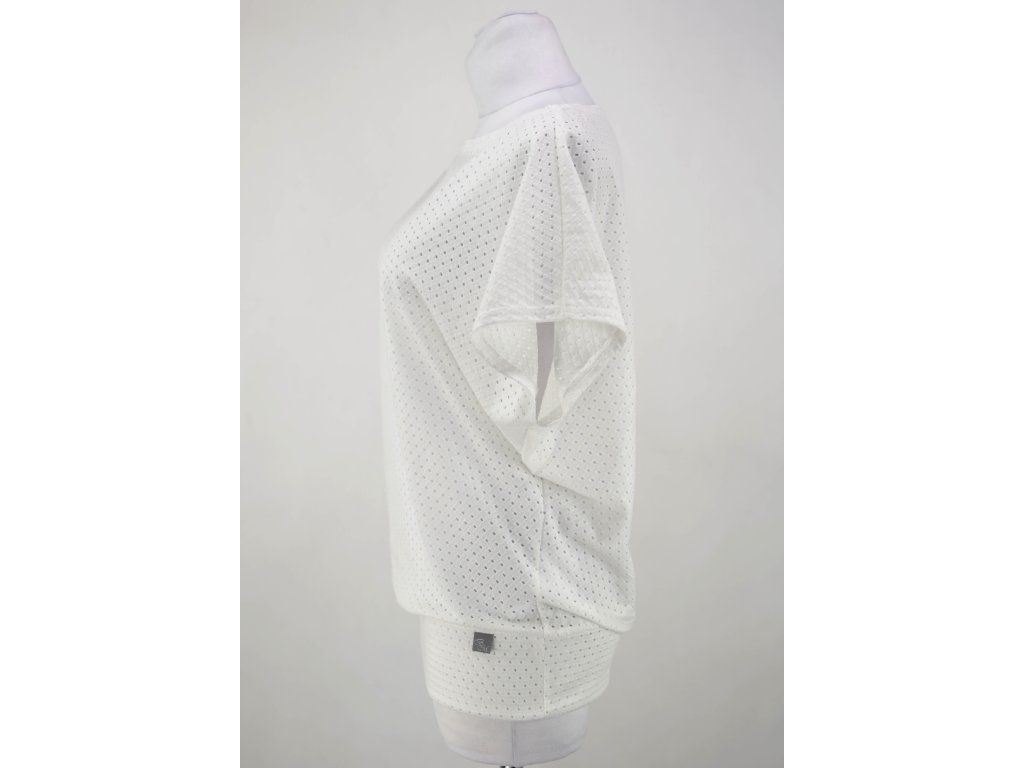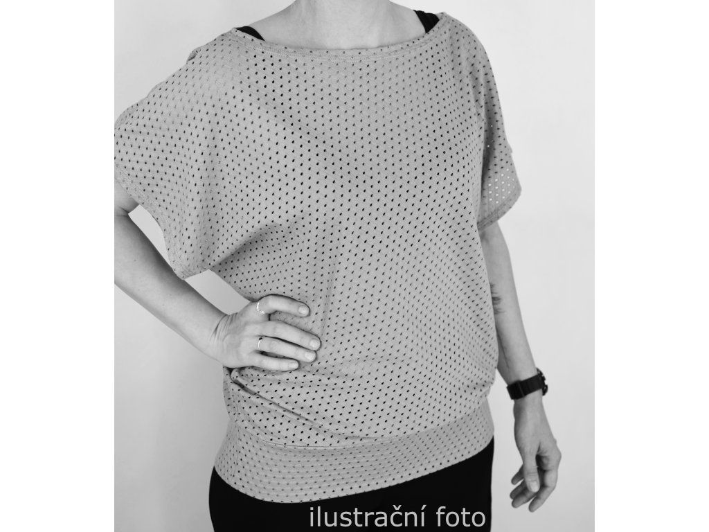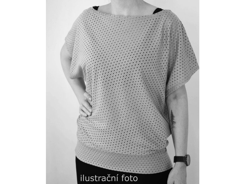 Dámské tričko netopýřího střihu. Má širší výstřih a netopýří krátké rukávky. Je s volným hrudníkem a je podkasaný do dvojitého lemu z úpletu v dolním okraji. Působí volně a ležérně. Madeira = dírková výšivka.
