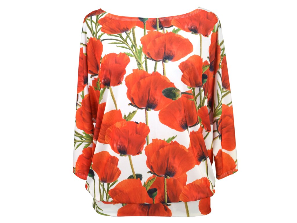 Dámské tričko netopýřího střihu z elastického úpletu. Má širší výstřih a netopýří rukávky. Je s volným hrudníkem a je podkasaný do dvojitého lemu v dolním okraji. Tričko působí volně a ležérně.