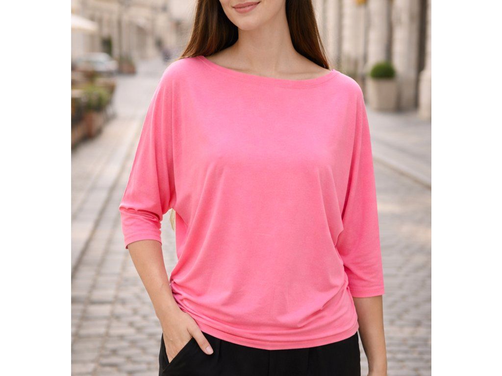 Dámské tričko netopýřího střihu z elastického úpletu z bambusové viskózy. Má širší výstřih a netopýří rukávky. Je s volným hrudníkem a je podkasaný do dvojitého lemu v dolním okraji. Tričko působí volně a ležérně. Bambus jako takový je pak velmi jemný a má i mírný lesk. Je antibakteriální a vhodný i na sport.