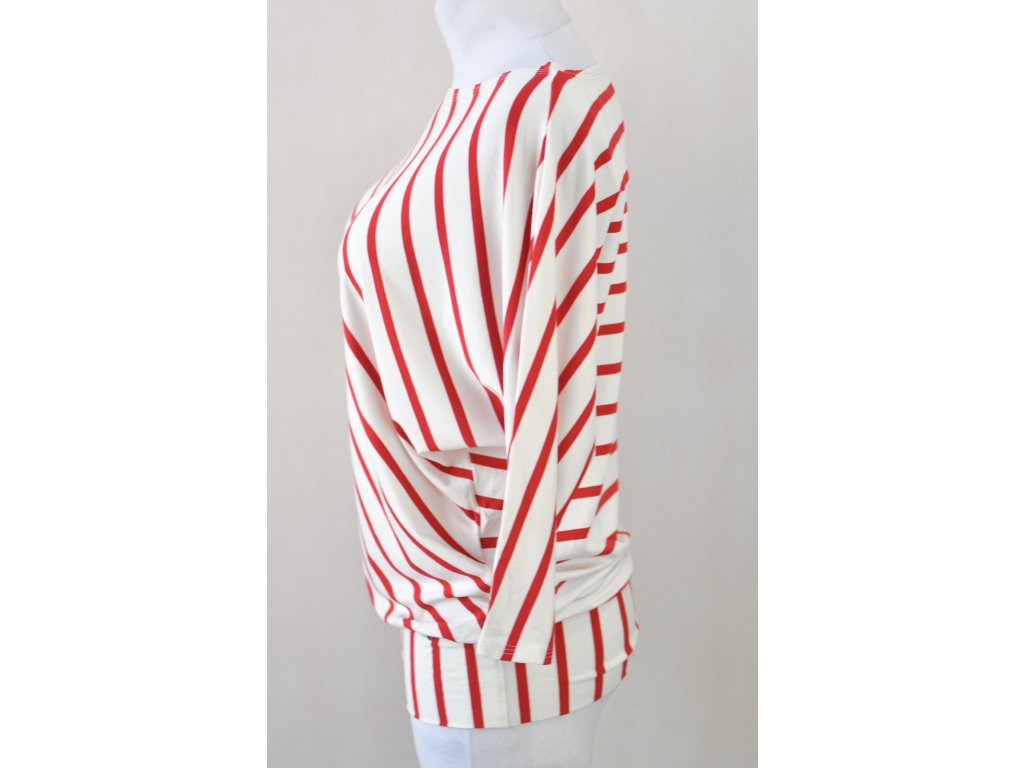 Dámské tričko netopýřího střihu z elastického úpletu z bambusové viskózy. Má širší výstřih a netopýří rukávky. Je s volným hrudníkem a je podkasaný do dvojitého lemu v dolním okraji. Tričko působí volně a ležérně. Bambus jako takový je pak velmi jemný a má i mírny lesk. Je antibakteriální a vhodný i na sport.