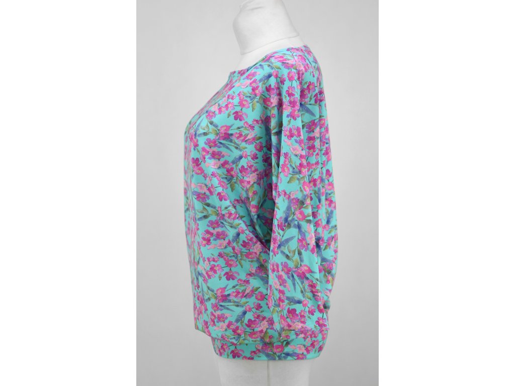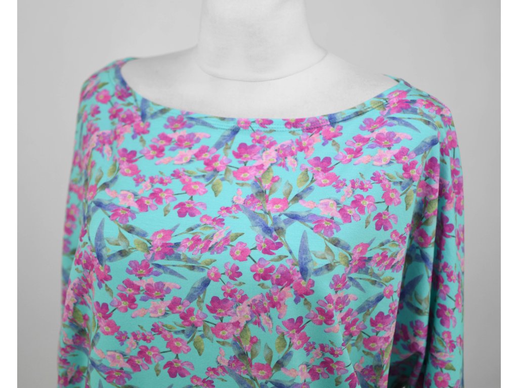 Dámské tričko netopýřího střihu z elastického úpletu. Má širší výstřih a netopýří rukávky. Je s volným hrudníkem a je podkasaný do dvojitého lemu v dolním okraji. Tričko působí volně a ležérně.