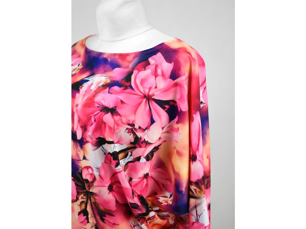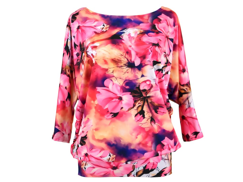 Dámské tričko netopýřího střihu z elastického úpletu. Má širší výstřih a netopýří rukávky. Je s volným hrudníkem a je podkasaný do dvojitého lemu v dolním okraji. Tričko působí volně a ležérně.