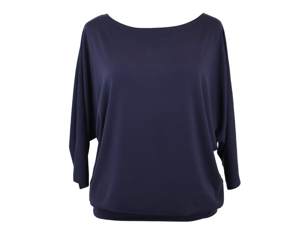 Dámské tričko netopýřího střihu z elastického úpletu. Má širší výstřih a netopýří rukávky. Je s volným hrudníkem a je podkasaný do dvojitého lemu v dolním okraji. Tričko působí volně a ležérně.