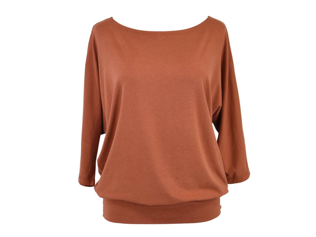 Dámské tričko netopýřího střihu z elastického úpletu z bambusové viskózy. Má širší výstřih a netopýří rukávky. Je s volným hrudníkem a je podkasaný do dvojitého lemu v dolním okraji. Tričko působí volně a ležérně. Bambus jako takový je pak velmi jemný a má i mírný lesk. Je antibakteriální a vhodný i na sport.