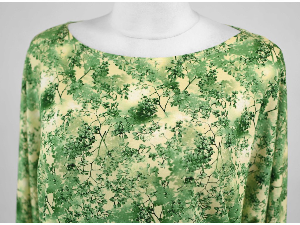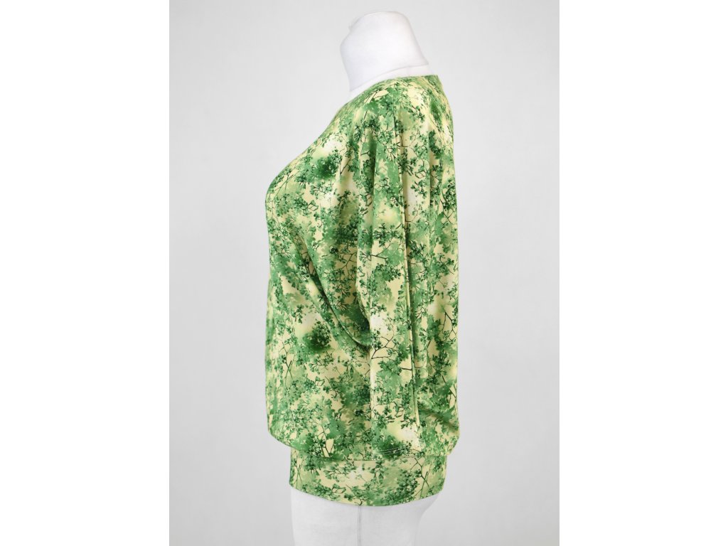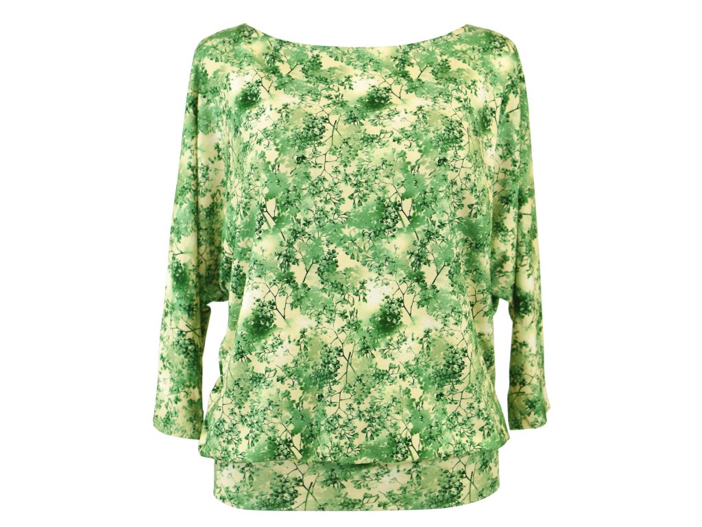 Dámské tričko netopýřího střihu. Má širší výstřih a netopýří rukávky. Je s volným hrudníkem a je podkasaný do dvojitého lemu z úpletu v dolním okraji. Působí volně a ležérně.