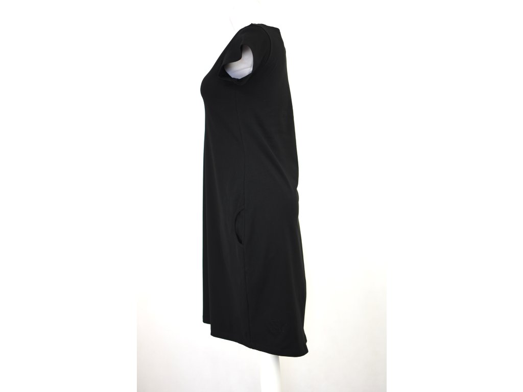 Dámské oversized šaty velmi volného střihu. Mají kulatý výstřih a krátké rukávy, od hrudníku se rozšiřují a v dolní části se jen lehce zužují. Zadní díl je mírně prodloužený, do kulata. Mají 2 přiznané kapsy v bocích.