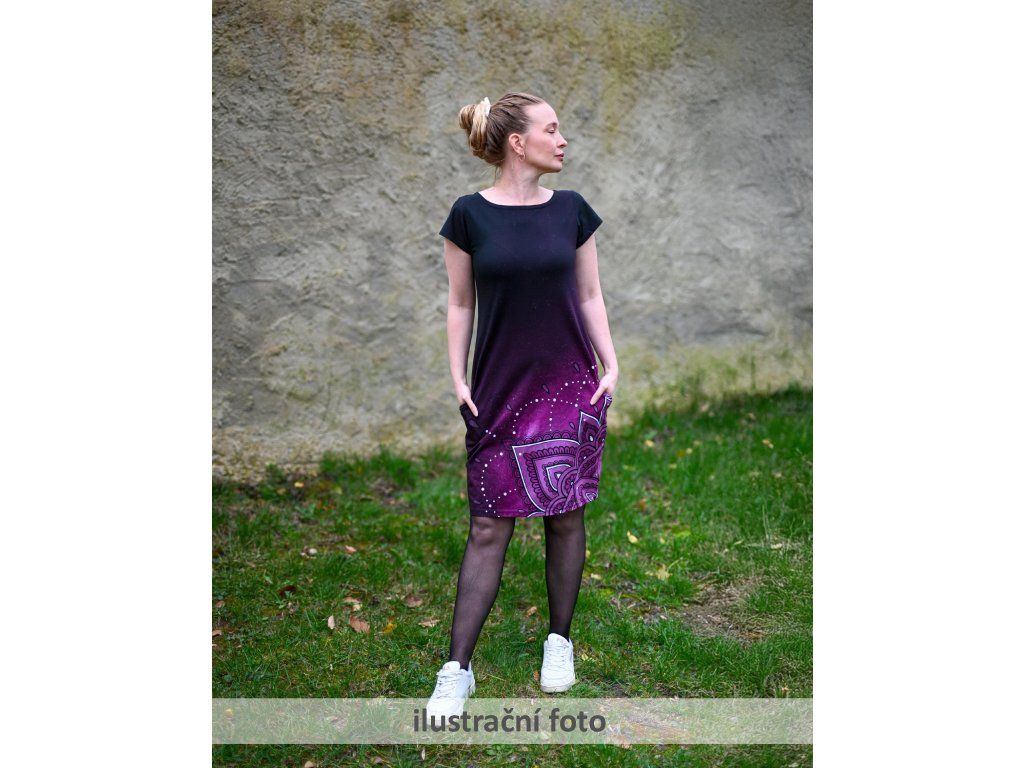 Dámské oversized šaty velmi volného střihu. Mají kulatý výstřih a krátké rukávy, od hrudníku se rozšiřují a v dolní části se jen lehce zužují. Zadní díl je mírně prodloužený, do kulata. Mají 2 přiznané kapsy v bocích.