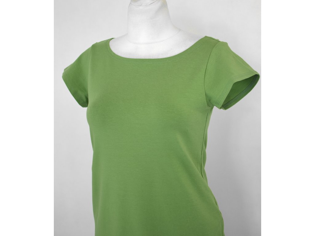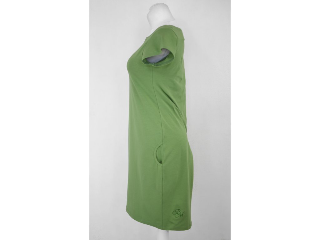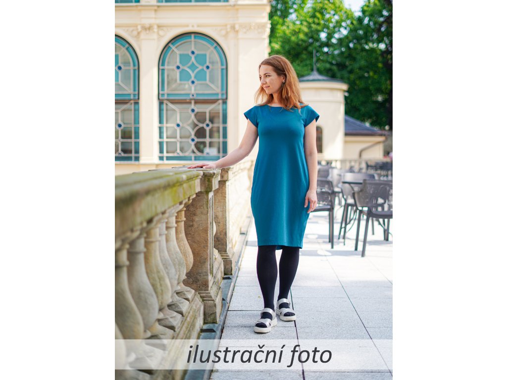 Dámské oversized šaty velmi volného střihu. Mají kulatý výstřih a krátké rukávy, od hrudníku se rozšiřují a v dolní části se jen lehce zužují. Zadní díl je mírně prodloužený, do kulata. Mají 2 přiznané kapsy v bocích.