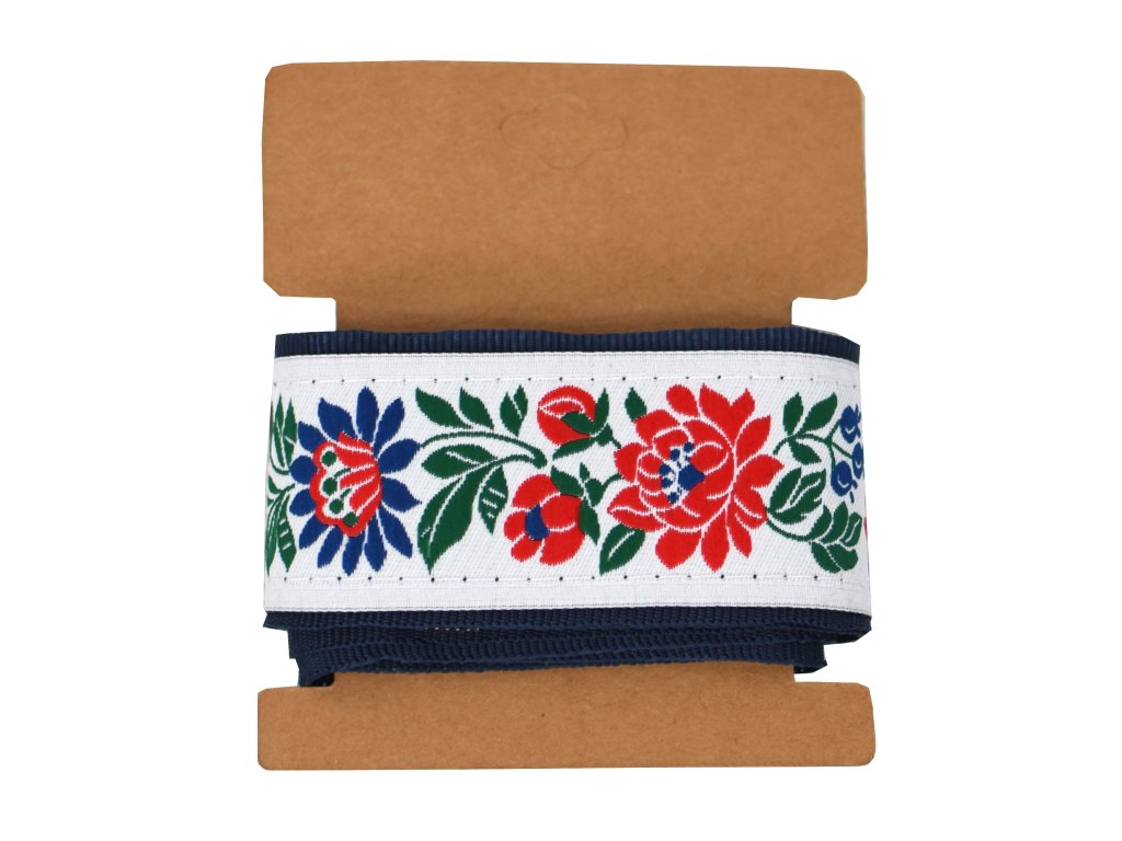 Pásek je ze stuhy (atlastová, jednolíc, oboulíc) s našitou krojovou vzorovkou.