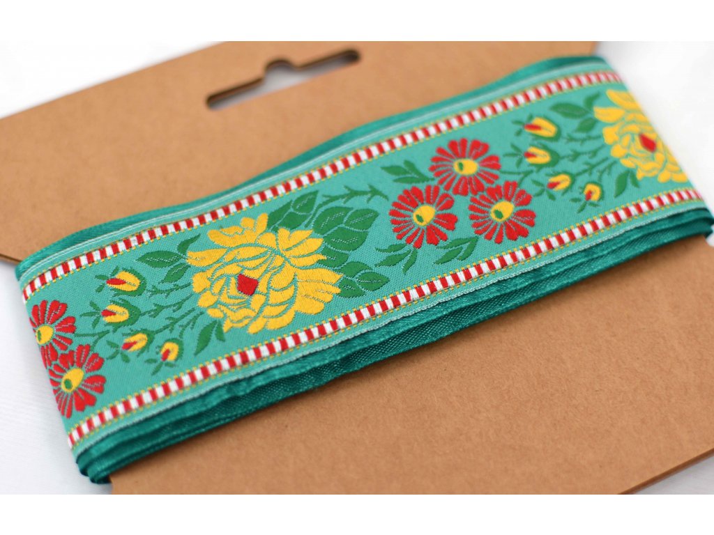 Pásek je ze stuhy (atlastová, jednolíc, oboulíc) s našitou krojovou vzorovkou.