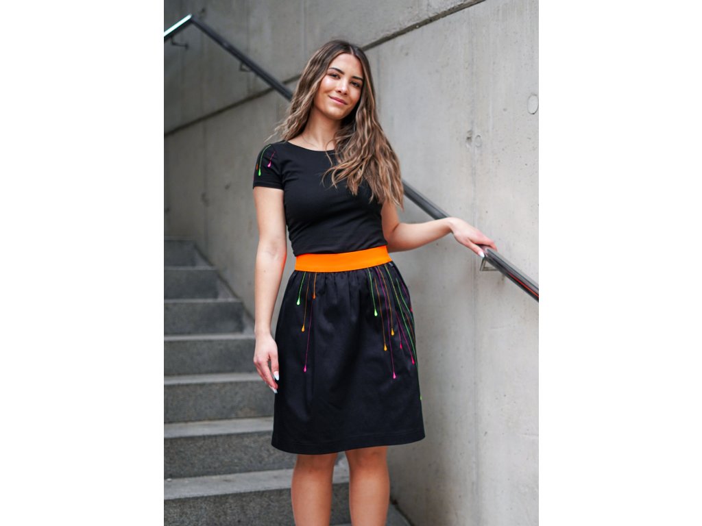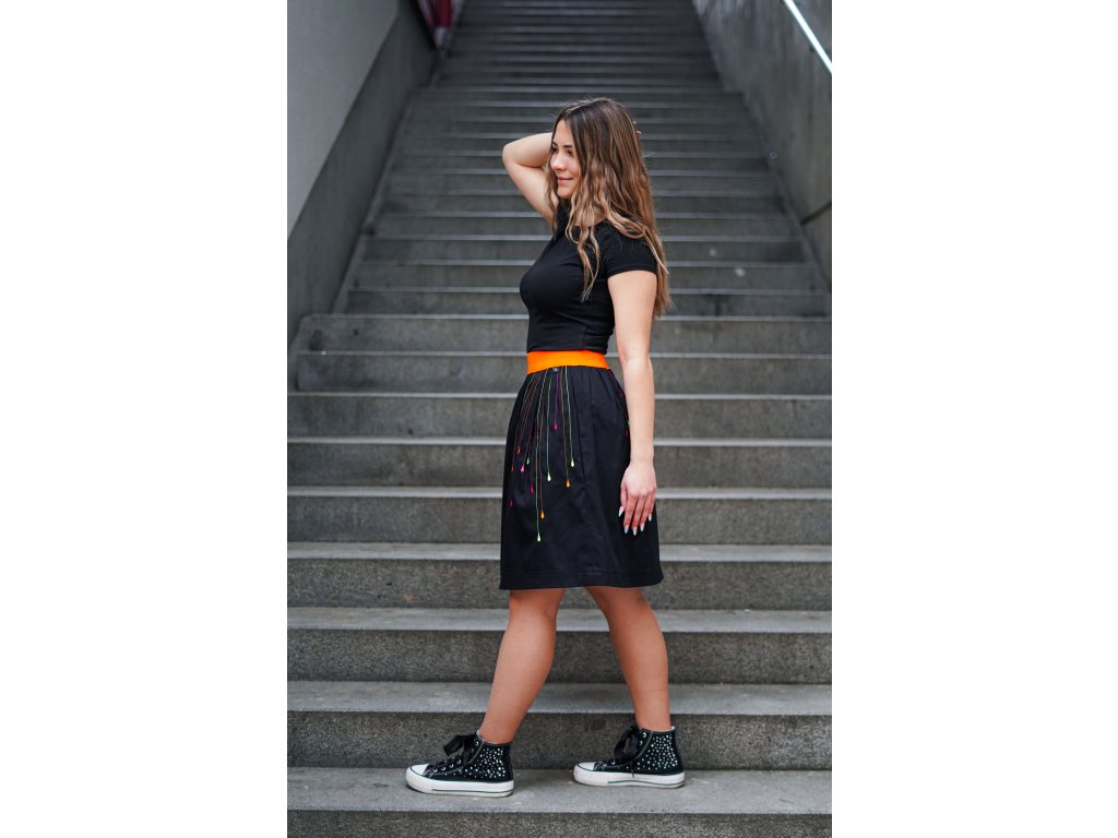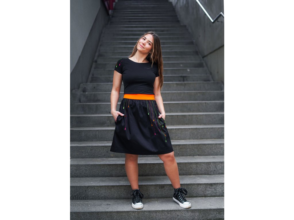Dámská sukně s elastickou gumou do pasu, rovného střihu se skrytými kapsami v bocích, má podšívku. Guma v pase je neonové oranžové barvy a nemá poutka.