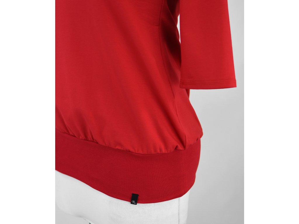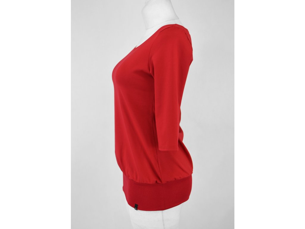 Dámské tričko z elastického úpletu, rovnějšího střihu. Kulatý výstřih, přes bříško volné a dolní lem v bocích je tvořen nápletem. Tričko se tak dá podkasat... :)