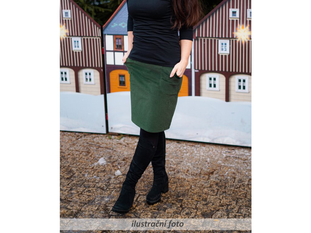 Dámská sukně pouzdrového střihu s dvojitým elastickým pasovým okrajem vhodným pro většinu velikostí. Sukně je na tělo a obepne hýždě a nohy. Kapsy v bocích jsou olemovány pružným nápletem. Nemá podšívku, dá se i tak nosit na punčochy i holé nohy.