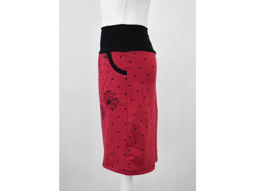 Dámská sukně pouzdrového střihu s dvojitým elastickým pasovým okrajem vhodným pro většinu velikostí. Sukně je na tělo a obepne hýždě a nohy. Kapsy v bocích jsou olemovány pružným nápletem. Nemá podšívku, dá se i tak nosit na punčochy i holé nohy.