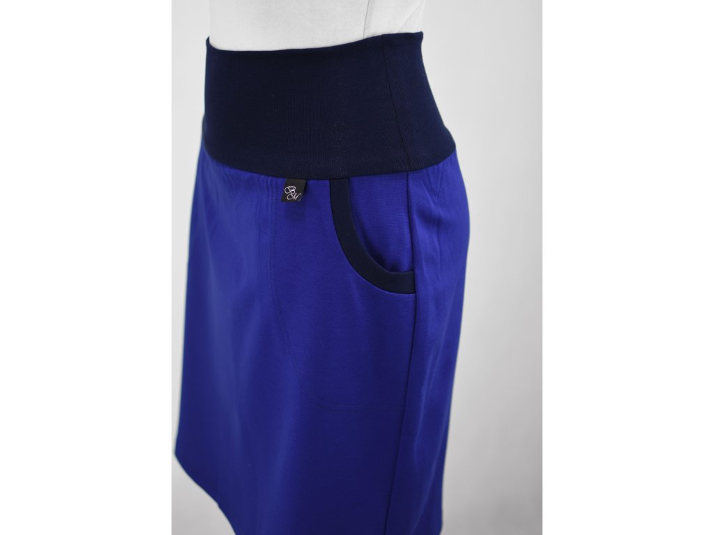 Dámská sukně pouzdrového střihu s dvojitým elastickým pasovým okrajem vhodným pro většinu velikostí. Sukně je na tělo a obepne hýždě a nohy. Kapsy v bocích jsou olemovány pružným nápletem. Nemá podšívku, dá se i tak nosit na punčochy i holé nohy.