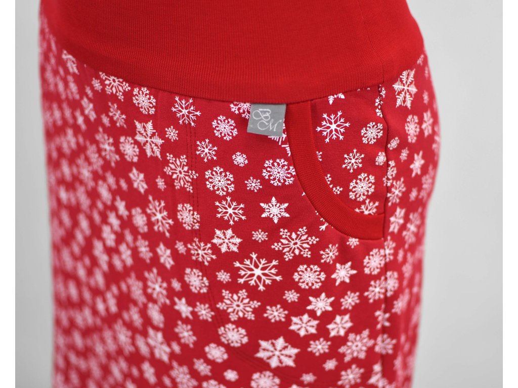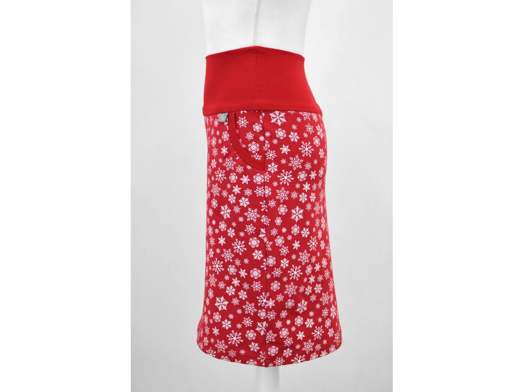 Dámská sukně pouzdrového střihu s dvojitým elastickým pasovým okrajem vhodným pro většinu velikostí. Sukně je na tělo a obepne hýždě a nohy. Kapsy v bocích jsou olemovány pružným nápletem. Nemá podšívku, dá se i tak nosit na punčochy i holé nohy. Zdobená potiskem vloček.