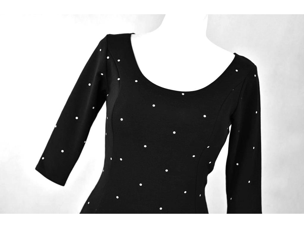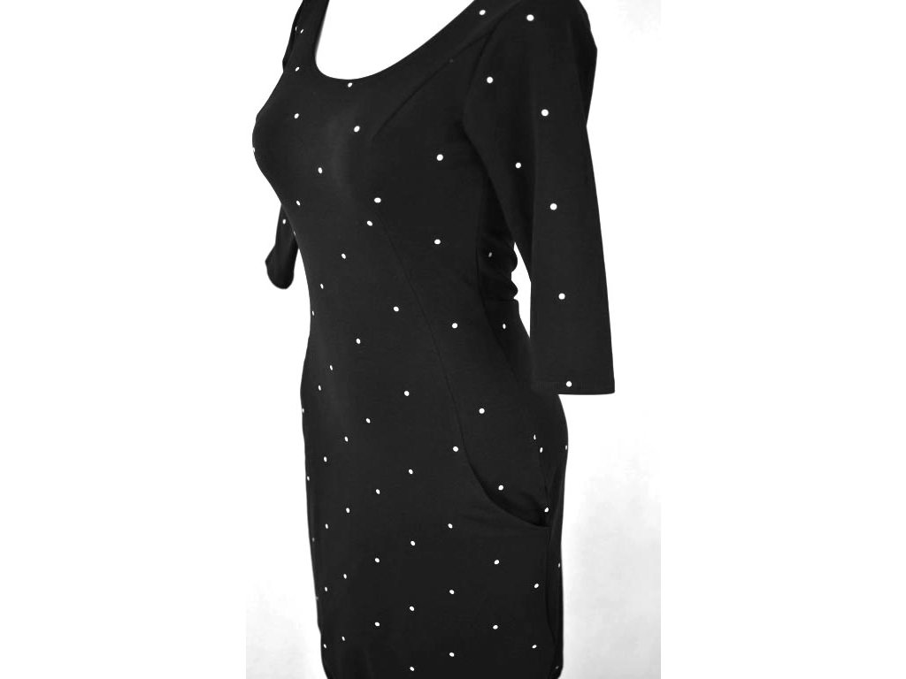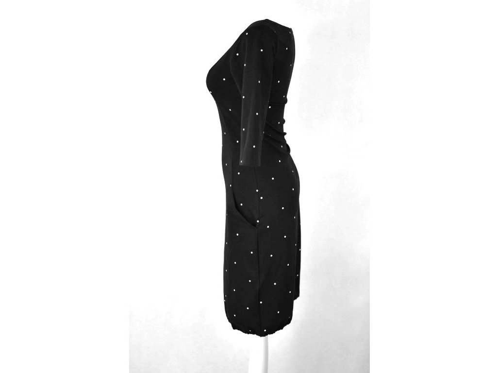 Dámské šaty princesového střihu z úpletu s více vykrojeným výstřihem a 3/4 rukávy. Modelující švy, jdoucí přes hrudník, tvoří ženskou siluetu a přechází v kapsy posazené v bocích. Boky se lehce rozšiřují a dolní okraj šatů tvoří podkasání díky provlečené gumičce (ta se dá kdykoli otvorem vyndat).