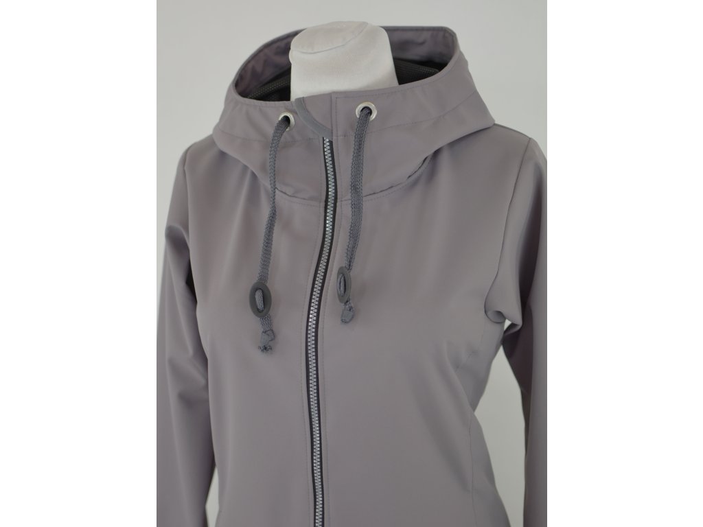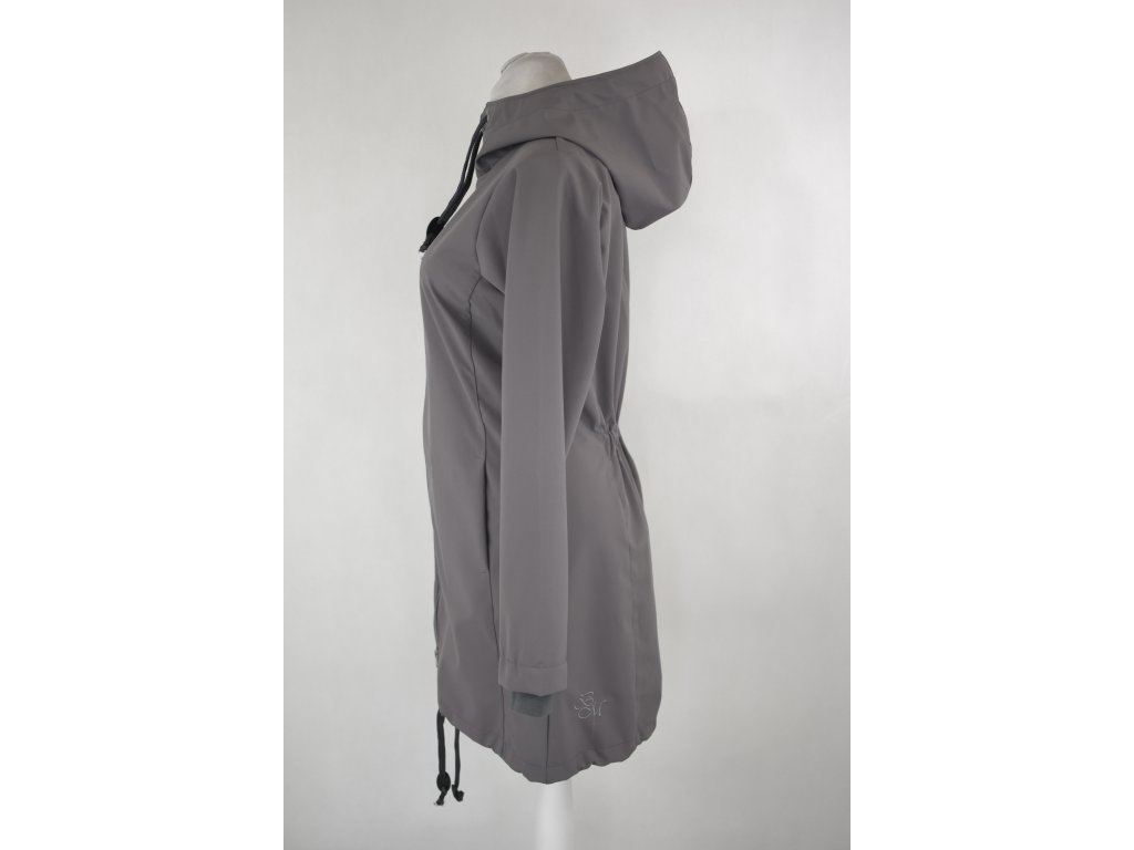 Dámský kabátek rovnějšího prodlouženého střihu s projmutým pasem, který tvaruje napevno všitá guma na zádech ve středu zadního dílu. Záda jsou nepatrně delší než přední část, spodek zadního dílu se lehce rozšiřuje a dolní lem je dokulata. Ve členícím švu v oblasti boků jsou dvě všité kapsy. Na zadním díle je vyšité logo.