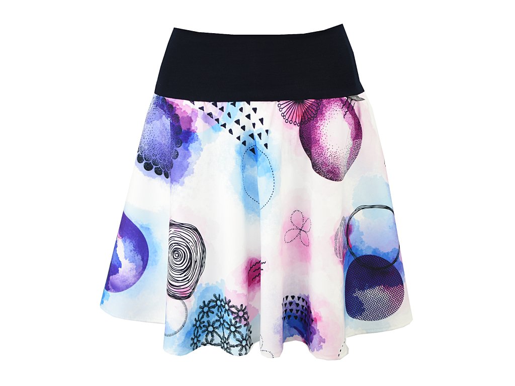 Dámská sukně půlkolového střihu s dvojitým elastickým pasovým okrajem vhodným pro většinu velikostí. Podšité polyesterovou látkou, která je vhodná jak na punčochy, tak na holé nohy a sukně se dá nosit celoročně. Z rubu elastického pasu je nechán otvor na případné vložení gumy na zpevnění či stažení pasu.