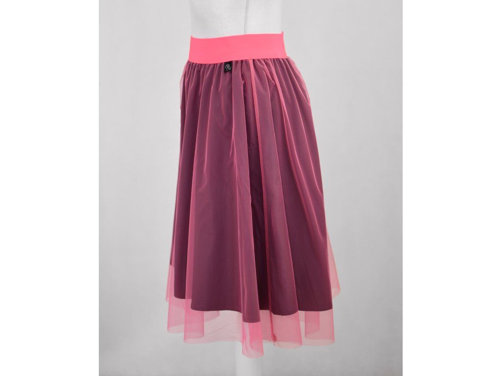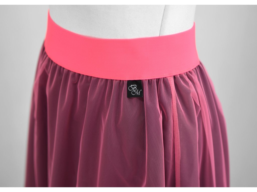 Dámská sukně s elastickou gumou do pasu, půlkolového střihu, s tylem. Sukně nemá podšívku. Délka je měřena bez tylu - tyl přesahuje cca o 5 cm přes sukni. Barva tylu je růžová, látka černá. Sukně nemá poutka na stuhu.