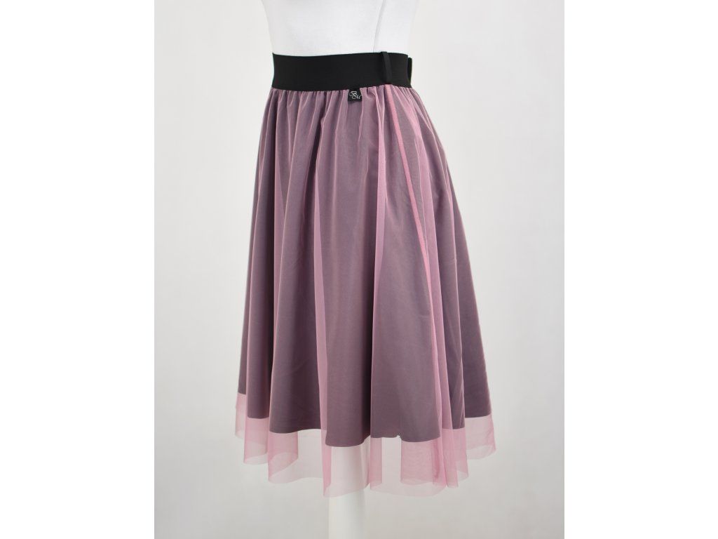 Dámská sukně s elastickou gumou do pasu, půlkolového střihu, s tylem. Sukně nemá podšívku. Délka je měřena bez tylu - tyl přesahuje cca o 5 cm přes sukni. Barva tylu je světle růžová, látka černá.