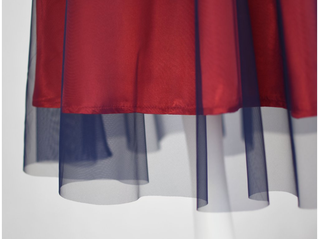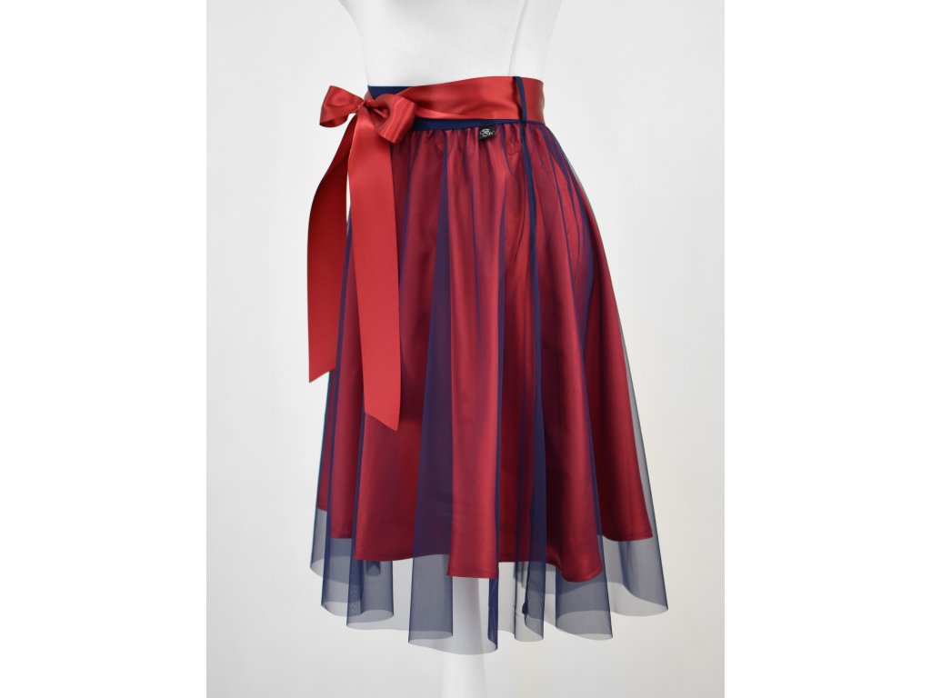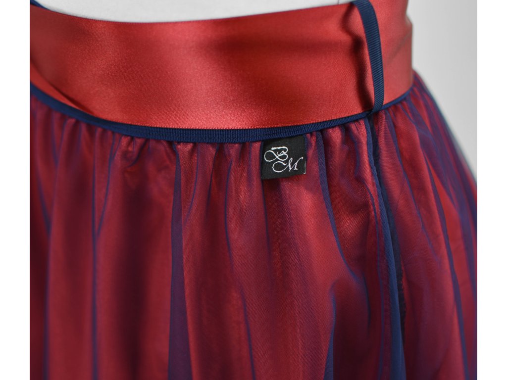 Dámská sukně s elastickou gumou do pasu, půlkolového střihu, s tylem. Sukně nemá podšívku. Délka je měřena bez tylu - tyl přesahuje cca o 5 cm přes sukni. Barva tylu je modrá, látka sukně červená.