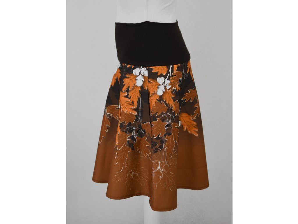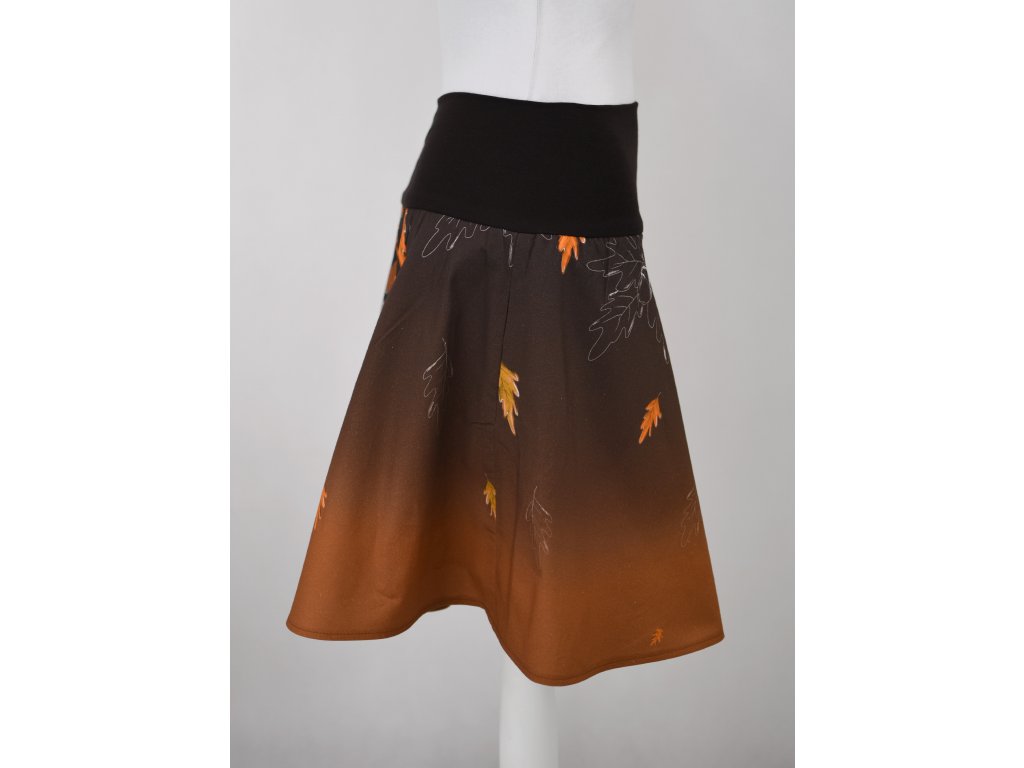 Dámská sukně půlkolového střihu s dvojitým elastickým pasovým okrajem vhodným pro většinu velikostí. Podšité polyesterovou látkou, která je vhodná jak na punčochy, tak na holé nohy a sukně se dá nosit celoročně. Z rubu elastického pasu je nechán otvor na případné vložení gumy na zpevnění či stažení pasu.