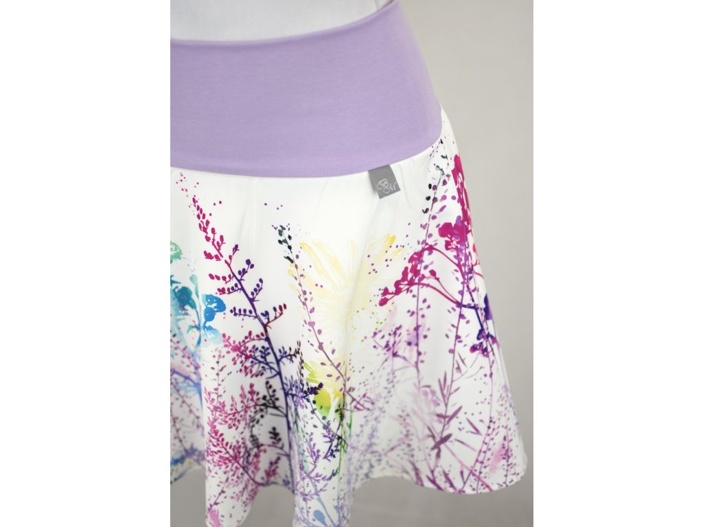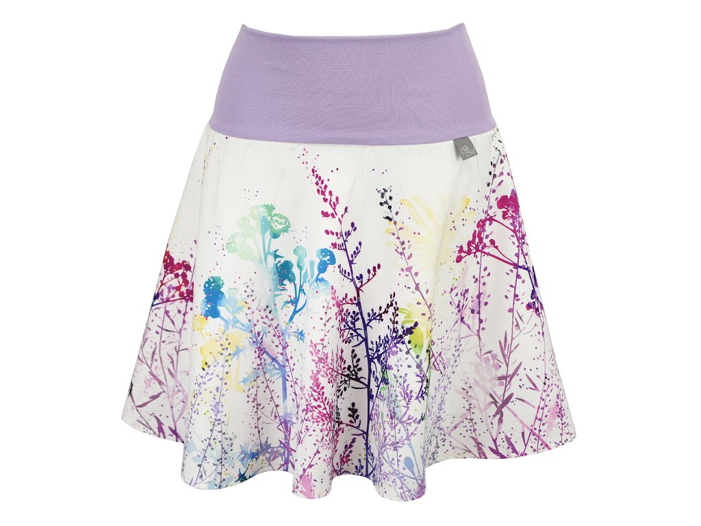 Dámská sukně půlkolového střihu s dvojitým elastickým pasovým okrajem vhodným pro většinu velikostí. Podšité polyesterovou látkou, která je vhodná jak na punčochy, tak na holé nohy a sukně se dá nosit celoročně. Z rubu elastického pasu je nechán otvor na případné vložení gumy na zpevnění či stažení pasu.