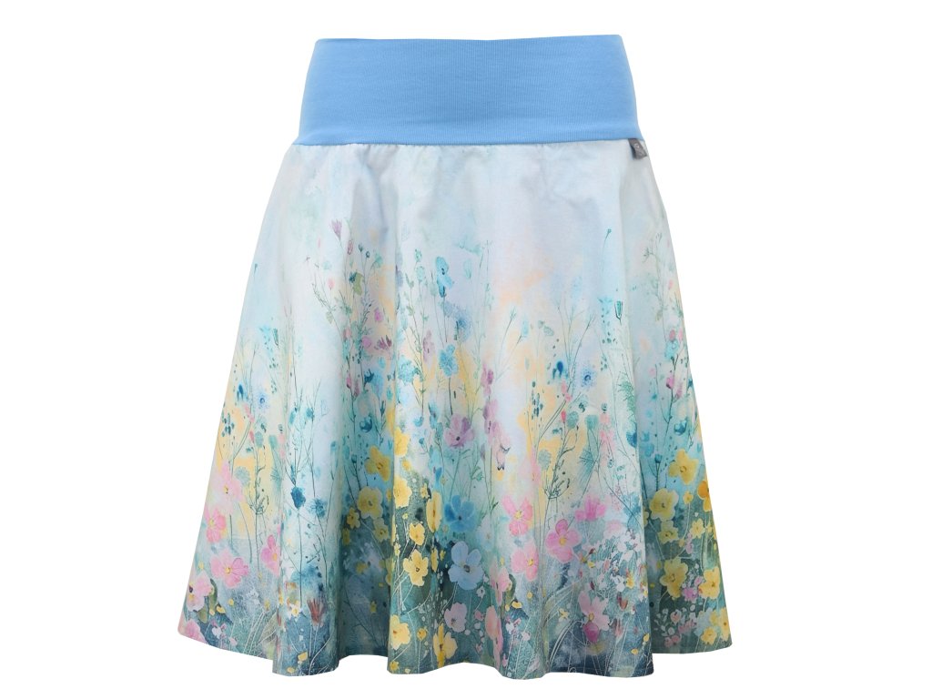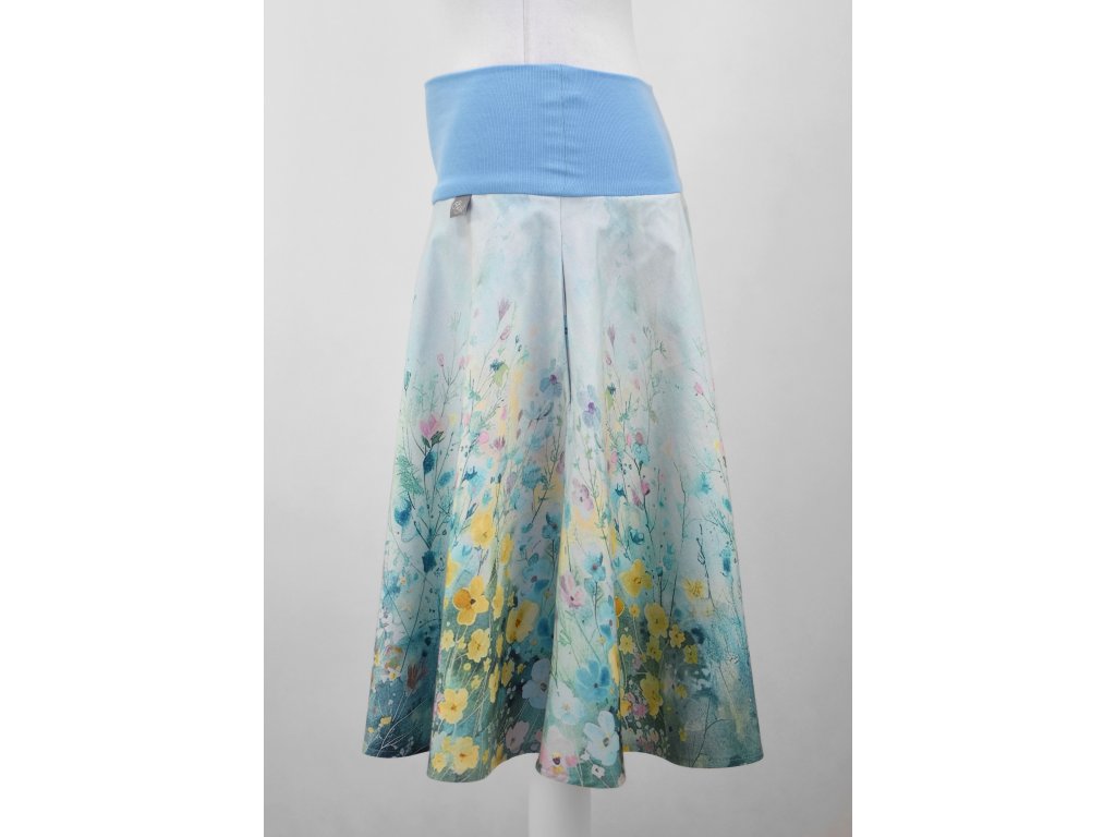 Dámská sukně půlkolového střihu s dvojitým elastickým pasovým okrajem vhodným pro většinu velikostí. Podšité polyesterovou látkou, která je vhodná jak na punčochy, tak na holé nohy a sukně se dá nosit celoročně. Z rubu elastického pasu je nechán otvor na případné vložení gumy na zpevnění či stažení pasu.