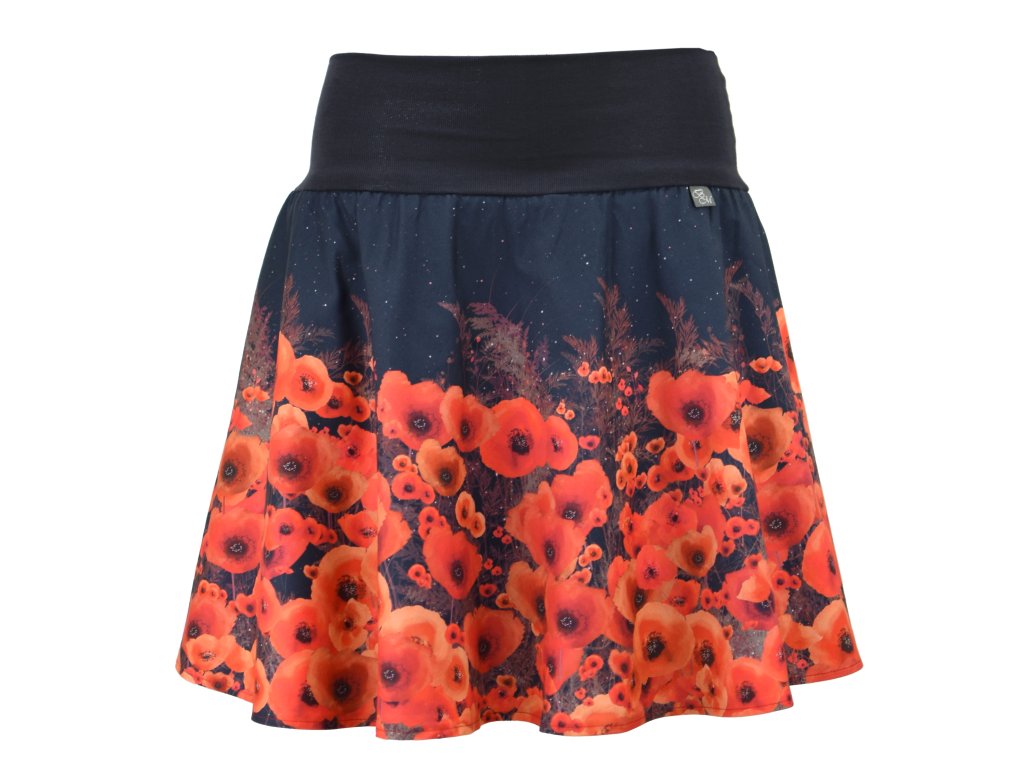 Dámská sukně půlkolového střihu s dvojitým elastickým pasovým okrajem vhodným pro většinu velikostí. Podšité polyesterovou látkou, která je vhodná jak na punčochy, tak na holé nohy a sukně se dá nosit celoročně. Z rubu elastického pasu je nechán otvor na případné vložení gumy na zpevnění či stažení pasu.