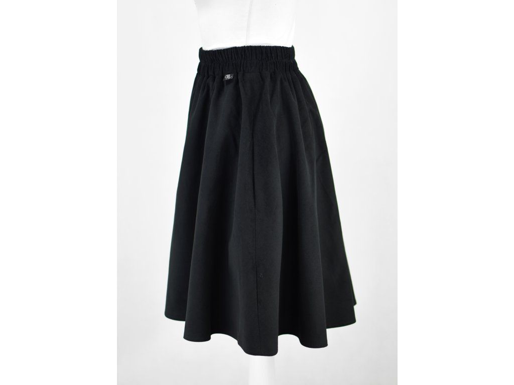 Dámská sukně půlkolového střihu, v pase se skrytou prošitou gumou a podšívkou. Z rubu pasu je skrytý otvor, kterým se dá vyměnit. V bocích nesmí chybět dvě skryté kapsy.