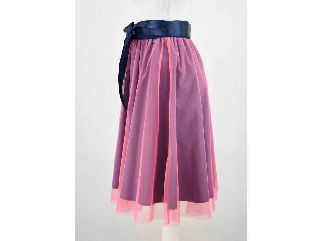 Dámská sukně s elastickou gumou do pasu, půlkolového střihu, s tylem. Sukně nemá podšívku. Délka je měřena bez tylu - tyl přesahuje cca o 5 cm přes sukni. Barva tylu je růžová, látka sukně modrá.