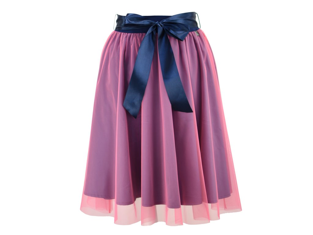 Dámská sukně s elastickou gumou do pasu, půlkolového střihu, s tylem. Sukně nemá podšívku. Délka je měřena bez tylu - tyl přesahuje cca o 5 cm přes sukni. Barva tylu je růžová, látka sukně modrá.