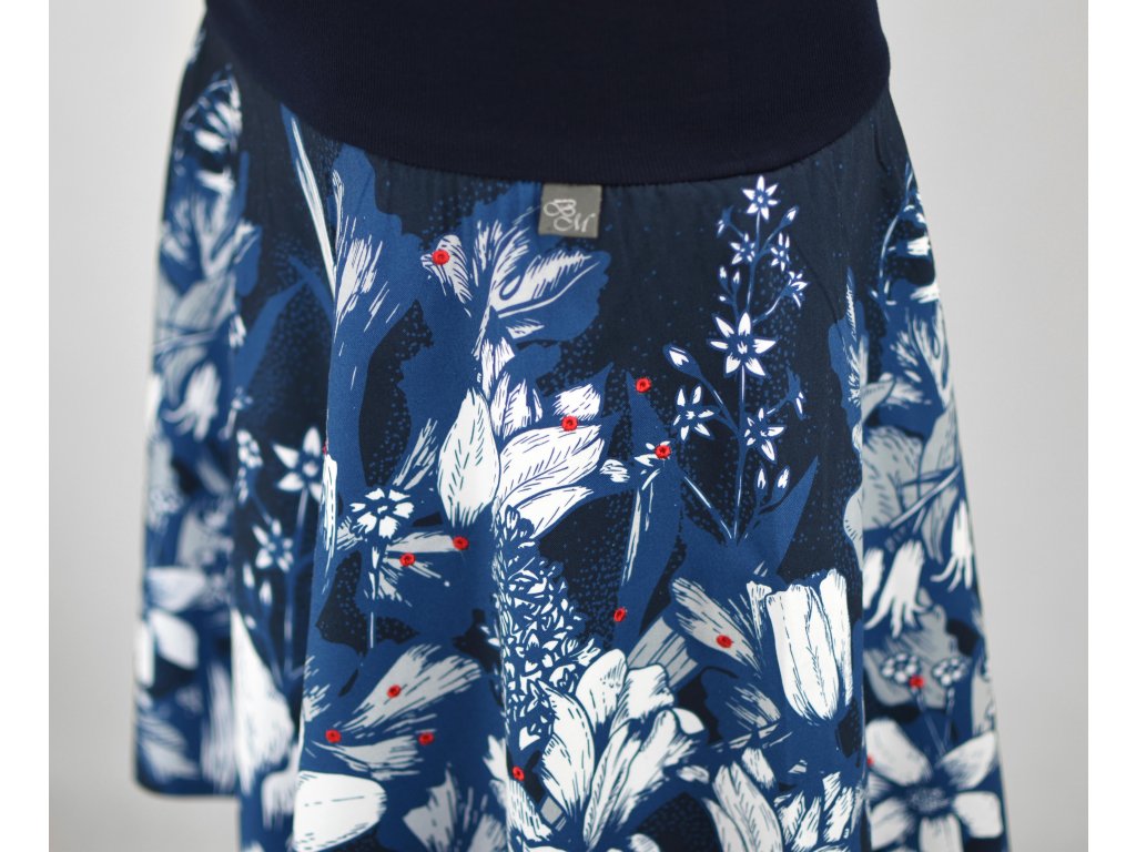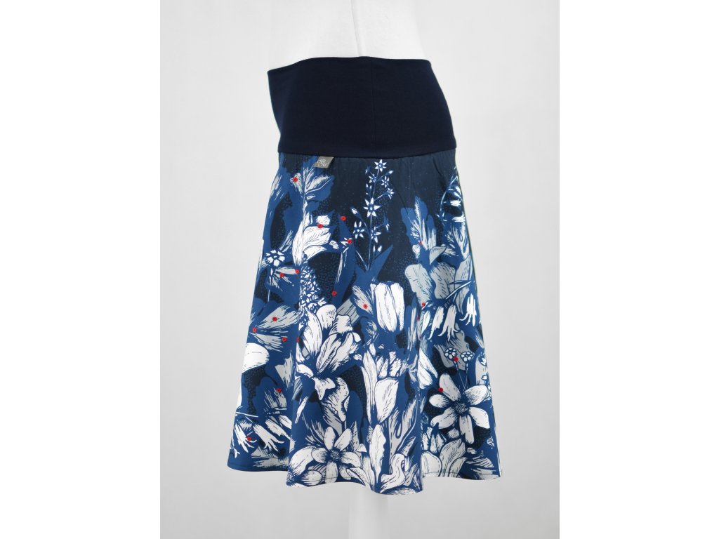 Dámská sukně půlkolového střihu s dvojitým elastickým pasovým okrajem vhodným pro většinu velikostí. Podšité polyesterovou látkou, která je vhodná jak na punčochy, tak na holé nohy a sukně se dá nosit celoročně. Z rubu elastického pasu je nechán otvor na případné vložení gumy na zpevnění či stažení pasu.