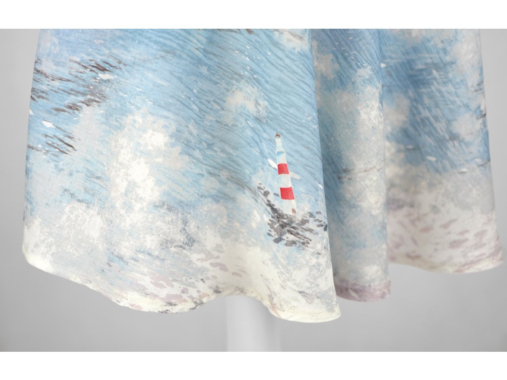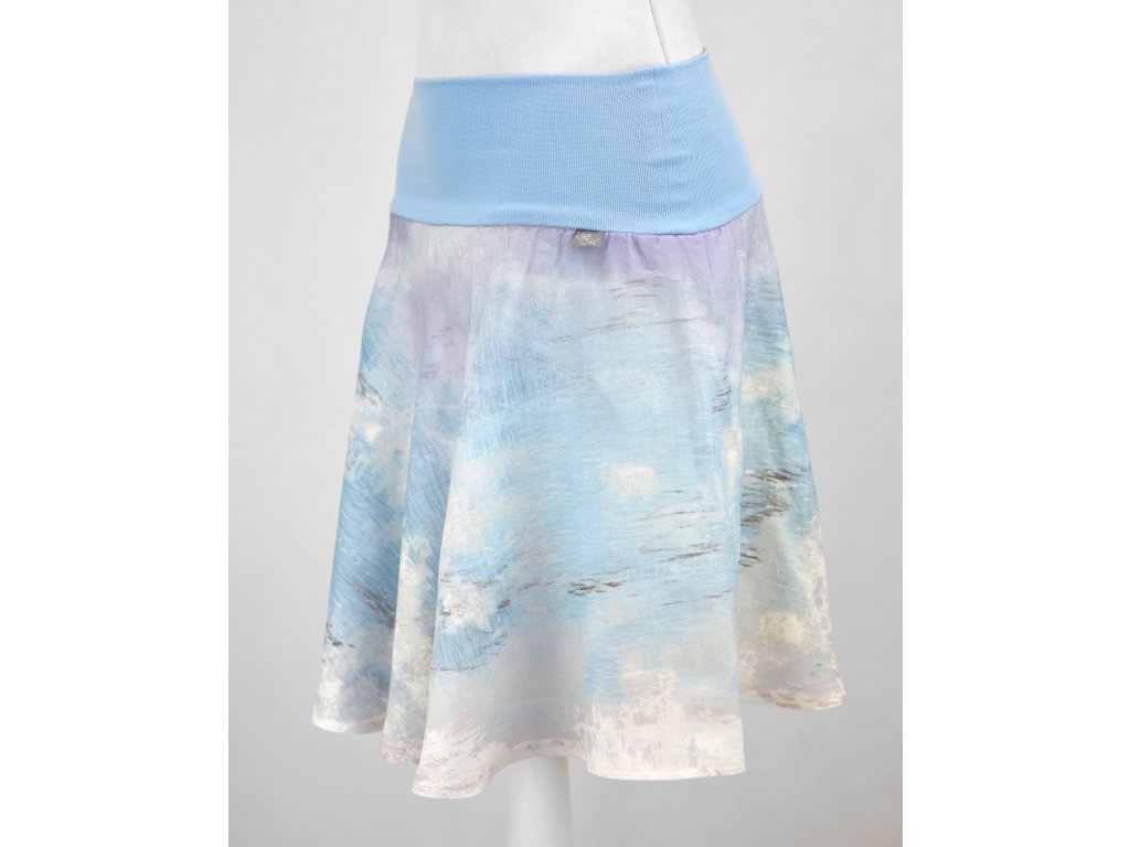 Dámská sukně půlkolového střihu s dvojitým elastickým pasovým okrajem vhodným pro většinu velikostí. Podšité polyesterovou látkou, která je vhodná jak na punčochy, tak na holé nohy a sukně se dá nosit celoročně. Z rubu elastického pasu je nechán otvor na případné vložení gumy na zpevnění či stažení pasu.