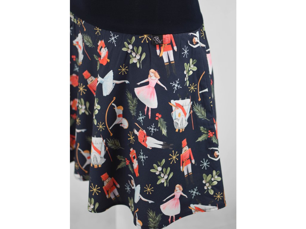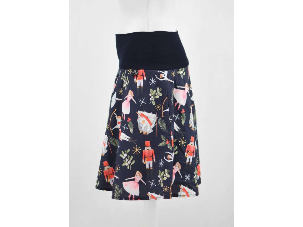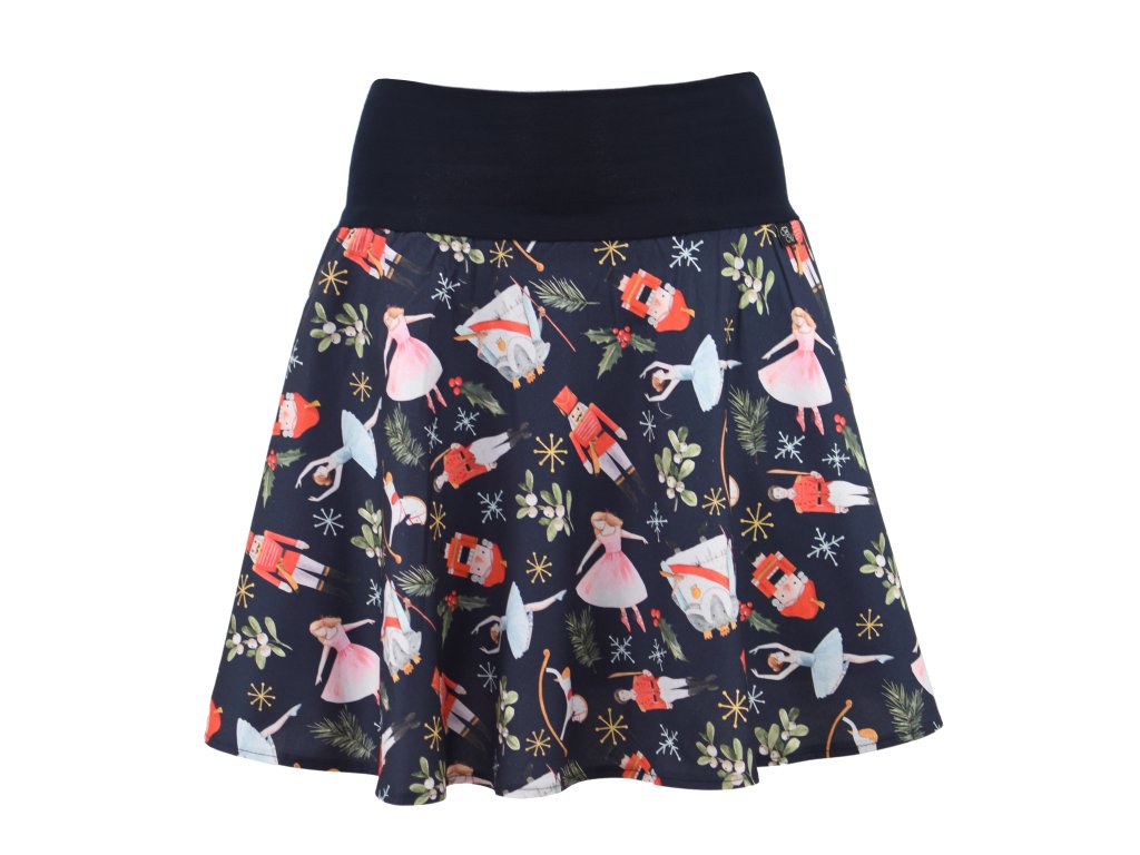 Dámská sukně půlkolového střihu s dvojitým elastickým pasovým okrajem vhodným pro většinu velikostí. Podšité polyesterovou látkou, která je vhodná jak na punčochy, tak na holé nohy a sukně se dá nosit celoročně. Z rubu elastického pasu je nechán otvor na případné vložení gumy na zpevnění či stažení pasu.