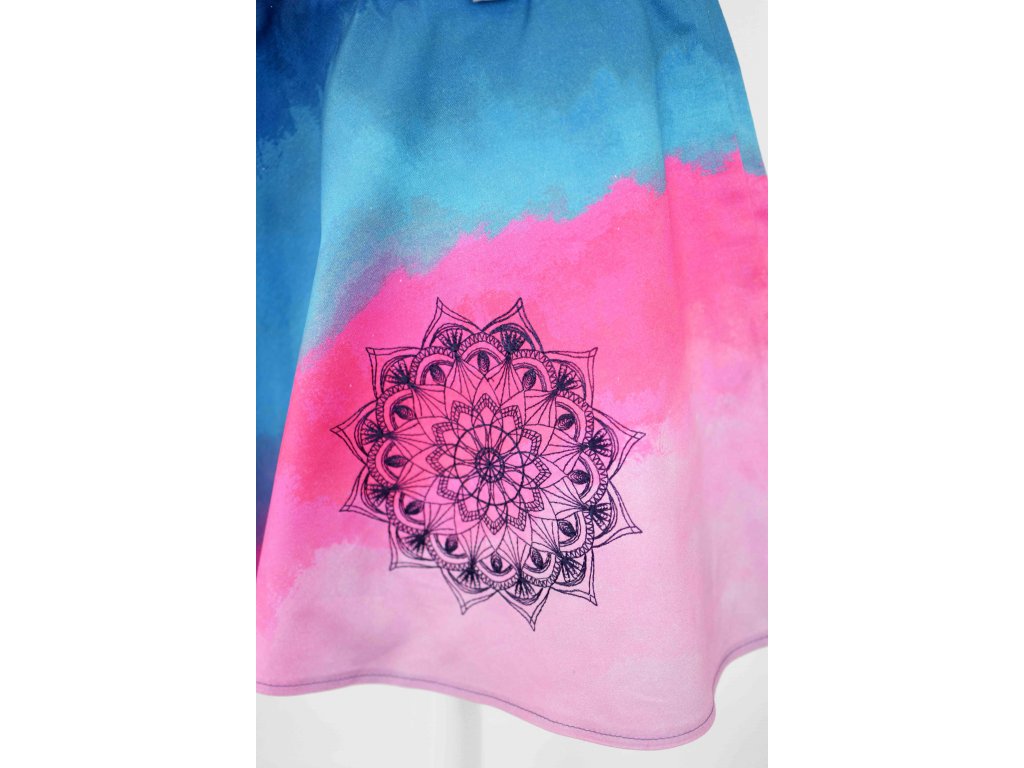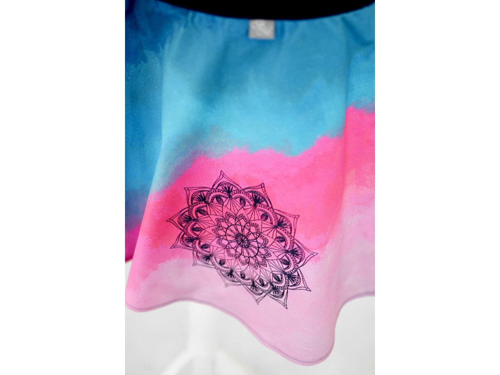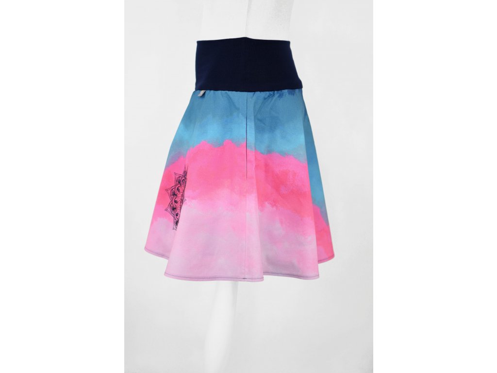 Dámská sukně půlkolového střihu s dvojitým elastickým pasovým okrajem vhodným pro většinu velikostí. Podšité polyesterovou látkou, která je vhodná jak na punčochy, tak na holé nohy a sukně se dá nosit celoročně. Z rubu elastického pasu je nechán otvor na případné vložení gumy na zpevnění či stažení pasu.