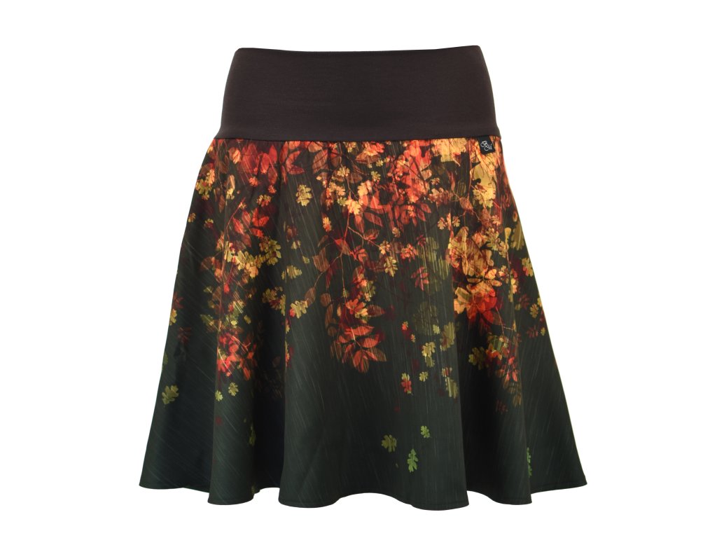 Dámská sukně půlkolového střihu s dvojitým elastickým pasovým okrajem vhodným pro většinu velikostí. Podšité polyesterovou látkou, která je vhodná jak na punčochy, tak na holé nohy a sukně se dá nosit celoročně. Z rubu elastického pasu je nechán otvor na případné vložení gumy na zpevnění či stažení pasu.
