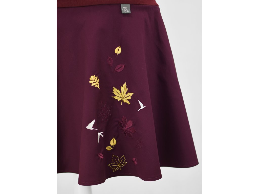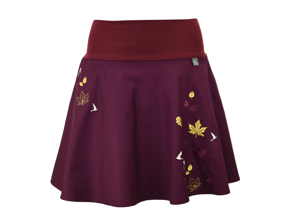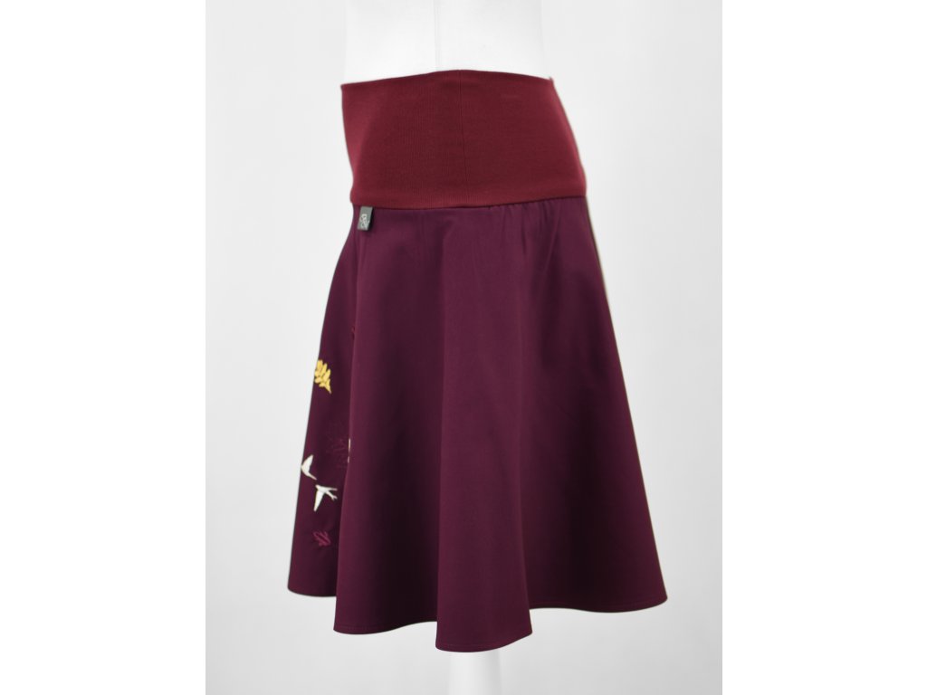 Dámská sukně půlkolového střihu s dvojitým elastickým pasovým okrajem vhodným pro většinu velikostí. Podšité polyesterovou látkou, která je vhodná jak na punčochy, tak na holé nohy a sukně se dá nosit celoročně. Z rubu elastického pasu je nechán otvor na případné vložení gumy na zpevnění či stažení pasu.